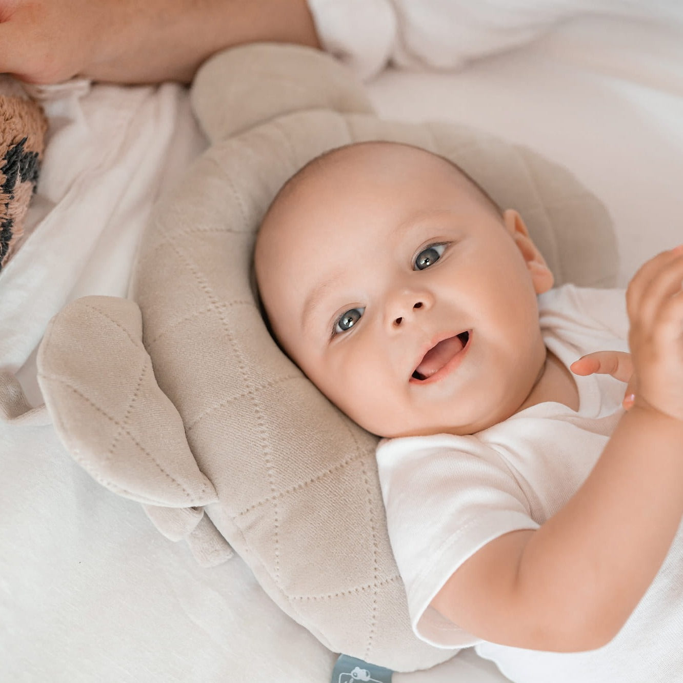 Sleepee zīdaiņu spilvens ir izgatavots no mīksta velūra un ir veidots kā rotaļlietas lācīša galva.