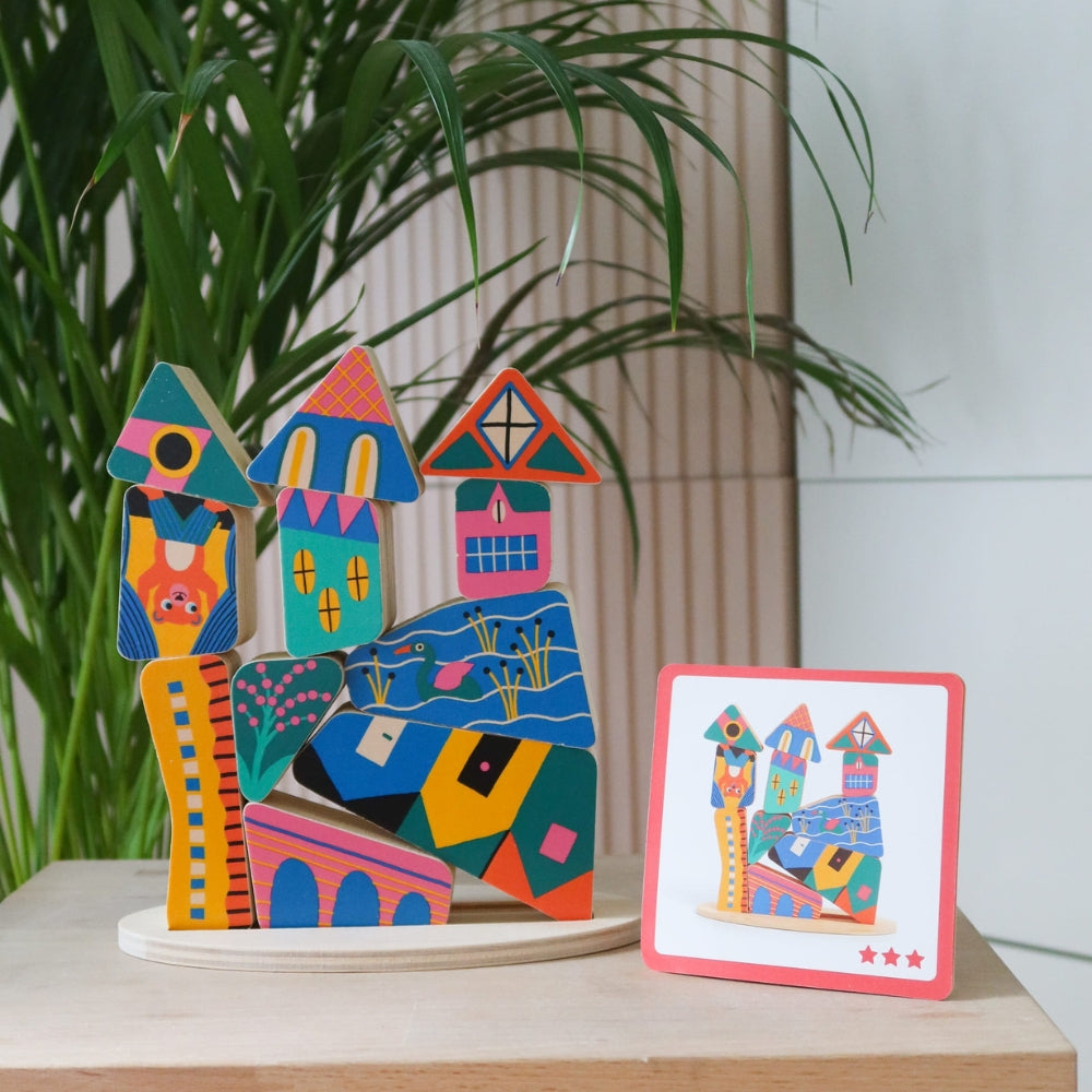 Djeco bērnu veiklības spēle ietver 20 dažādas grūtības pakāpes māju modeļus, kas ļauj bērniem pakāpeniski attīstīt savas būvniecības prasmes.