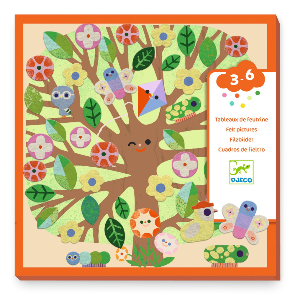 Djeco mākslas komplekts ieved bērnu dabas pasaulē ar filca uzlīmēm, ar kurām var izrotāt koku ilustrācijas.