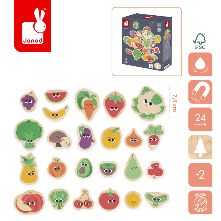 Komplektā ir 24 dažāda izmēra koka magnēti bērniem, tostarp pipari, tomāti, avokado, baklažāni vai puse kivi.