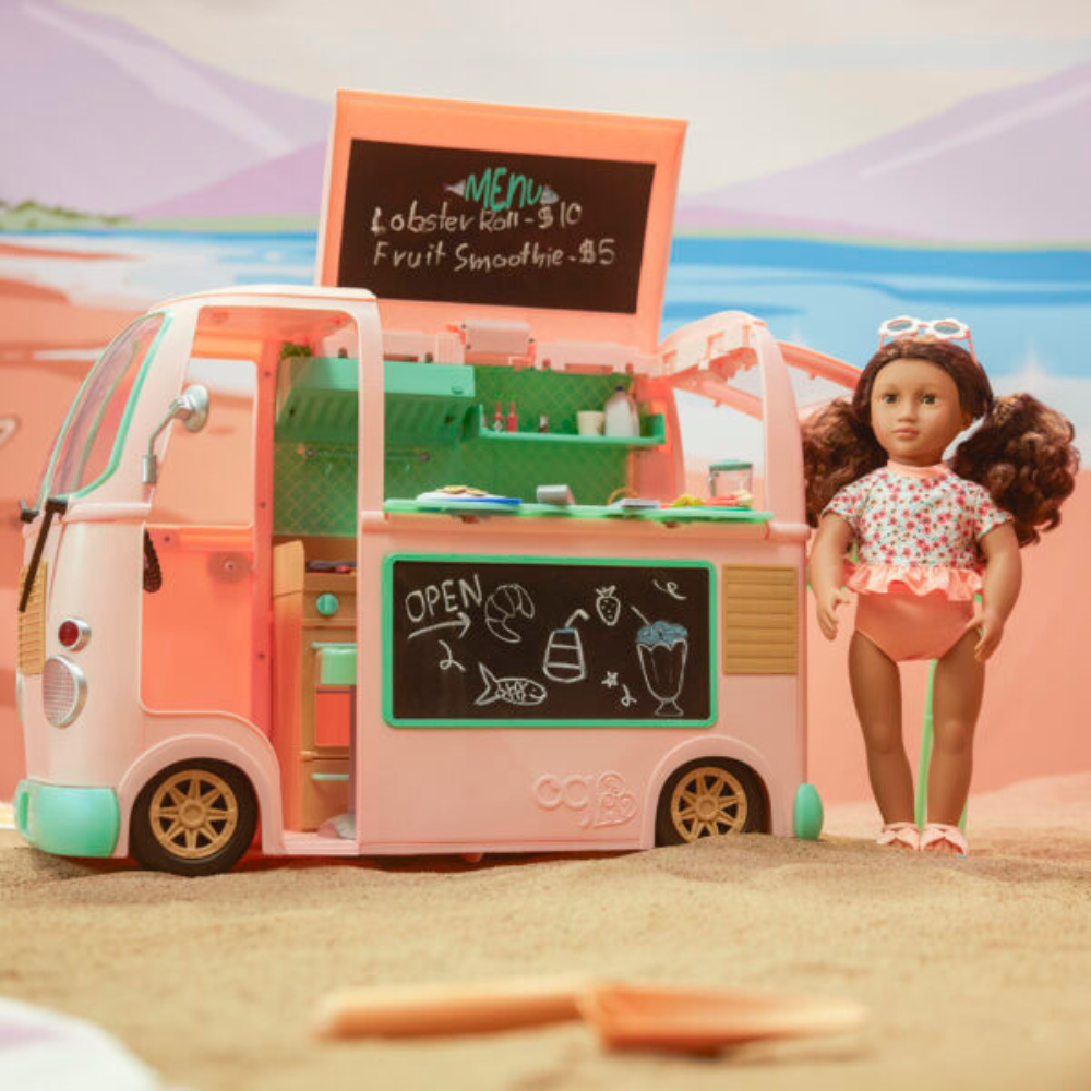 Our Generation vasaras ēdienu furgons ir mobilā virtuve, kas pilna ar brīvdienu garšām lellēm.