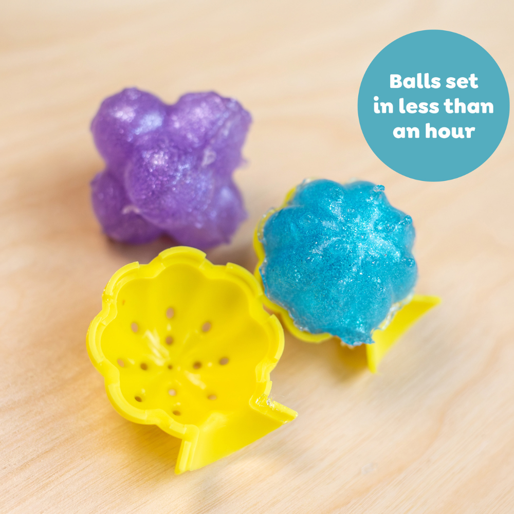 Šis radošais komplekts aicina bērnus izgatavot divas spīdošas bumbiņas: vienu klasisku un vienu ar pārsteidzošu lidojuma trajektoriju.
