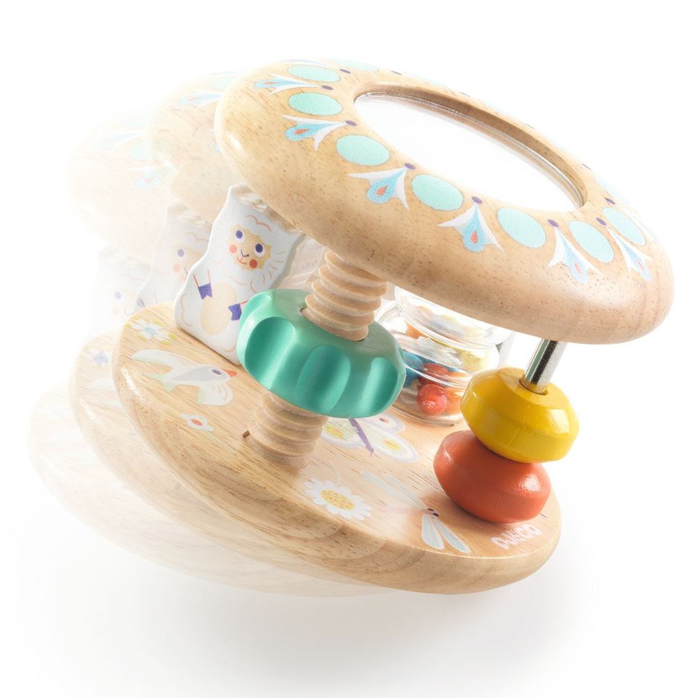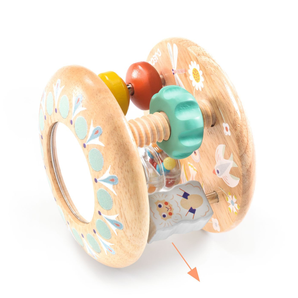 Šī kompakta rotaļlieta maigās pasteļtoņos ir izgatavota no dabīgā koka un aicina jūsu mazuli izmēģināt līdz pat sešām aktivitātēm: pagriezt mazā aitiņa, pārvietot pērlītes, ripināt to uz sāniem, vērot, kā pērlītes krīt, uzskrūvēt ziedu un skatīties spogulī.