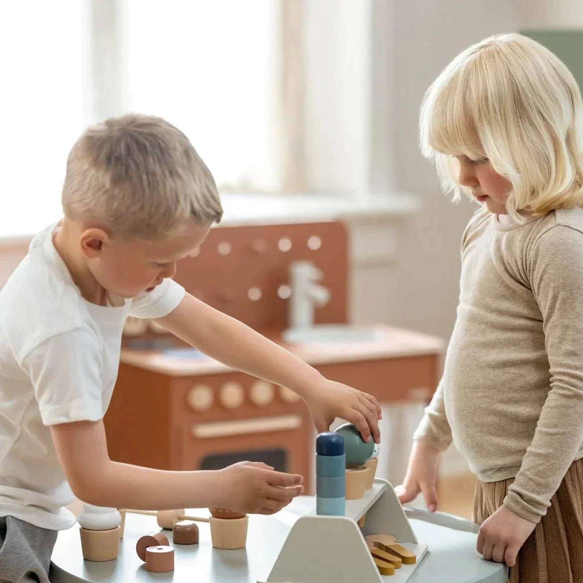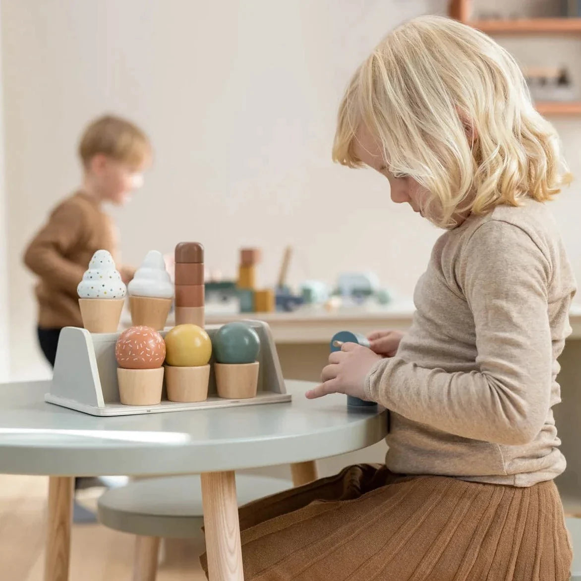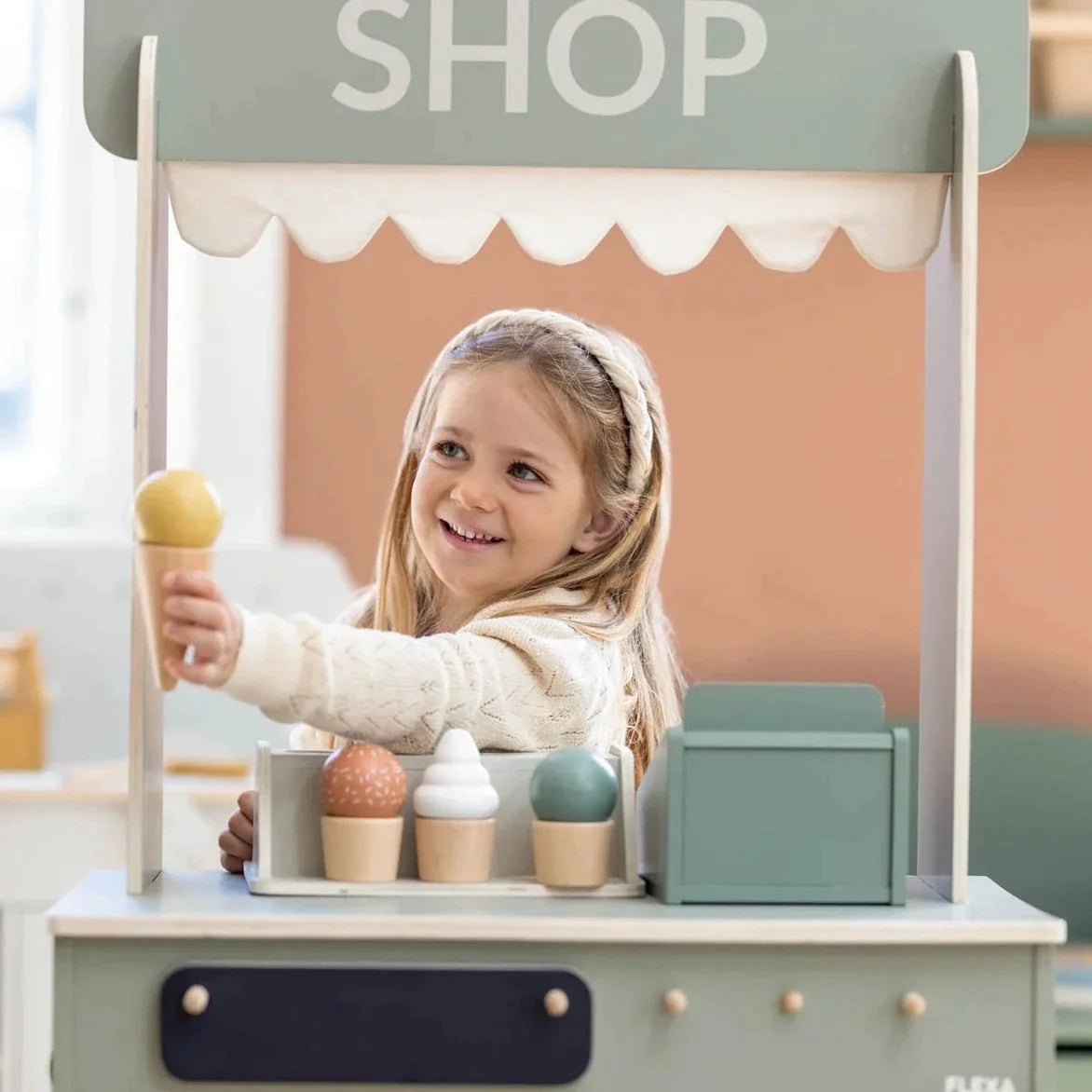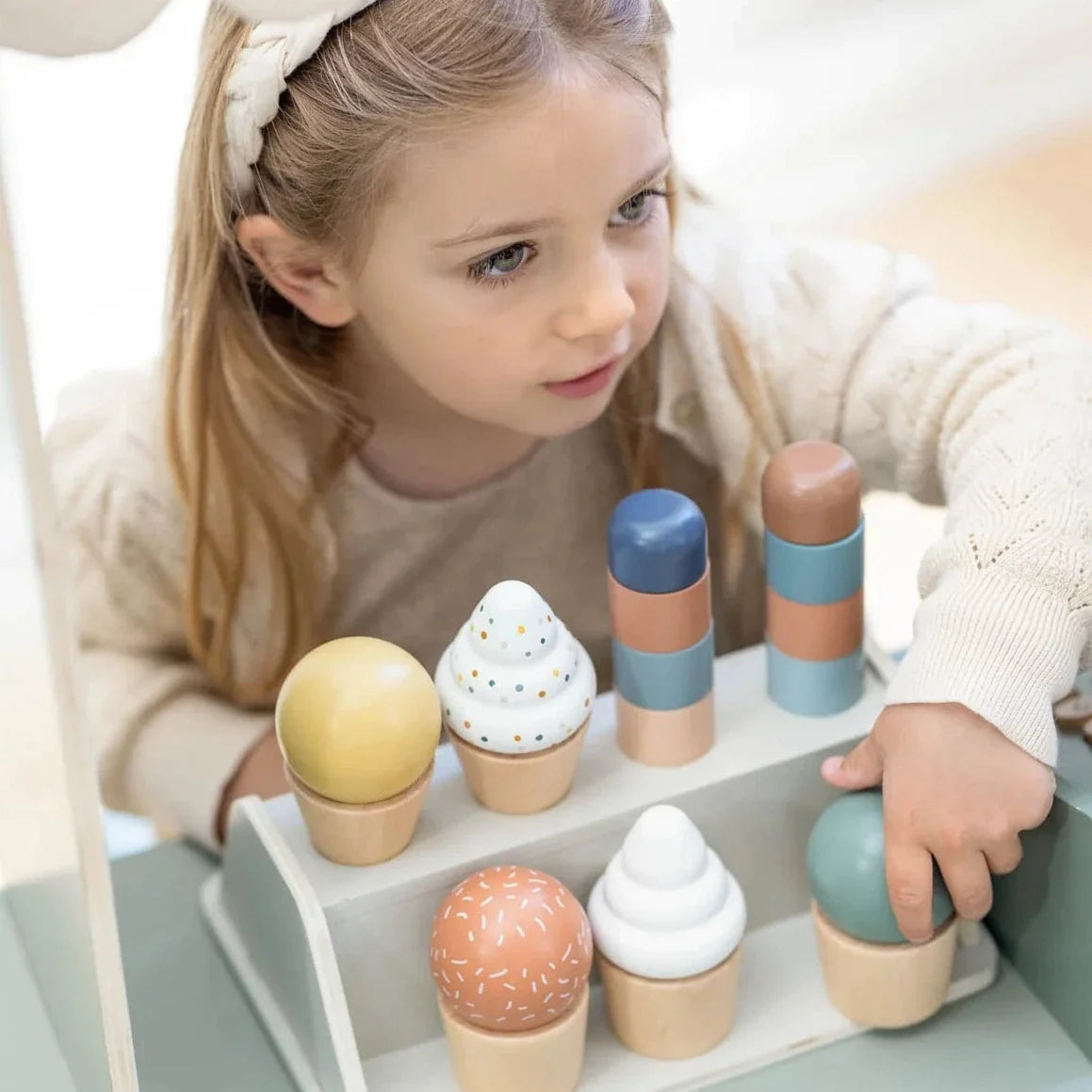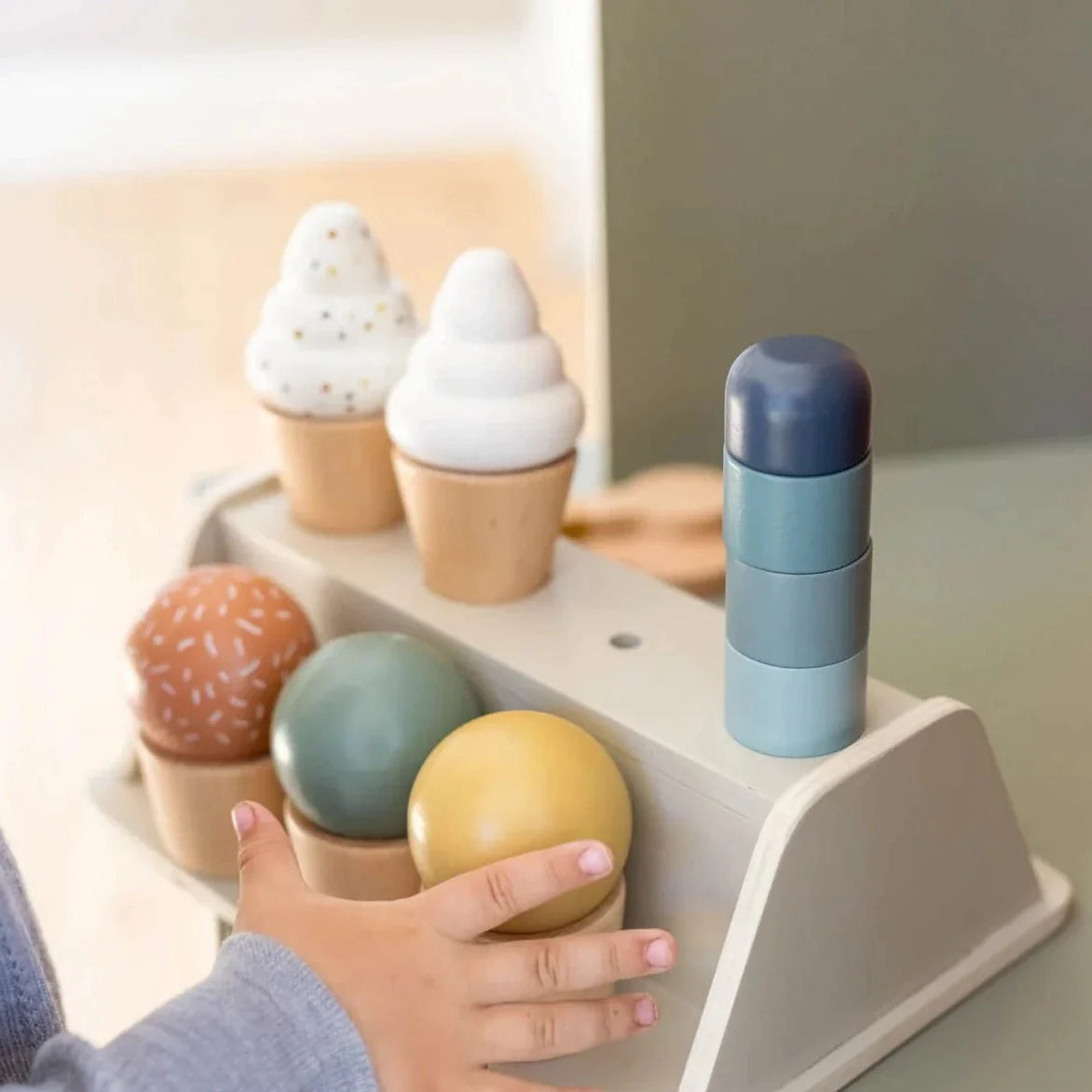 Tāpat kā visas Flexa rotaļlietas, arī saldējuma komplekts ir izgatavots no cieta, dabiska koka.
