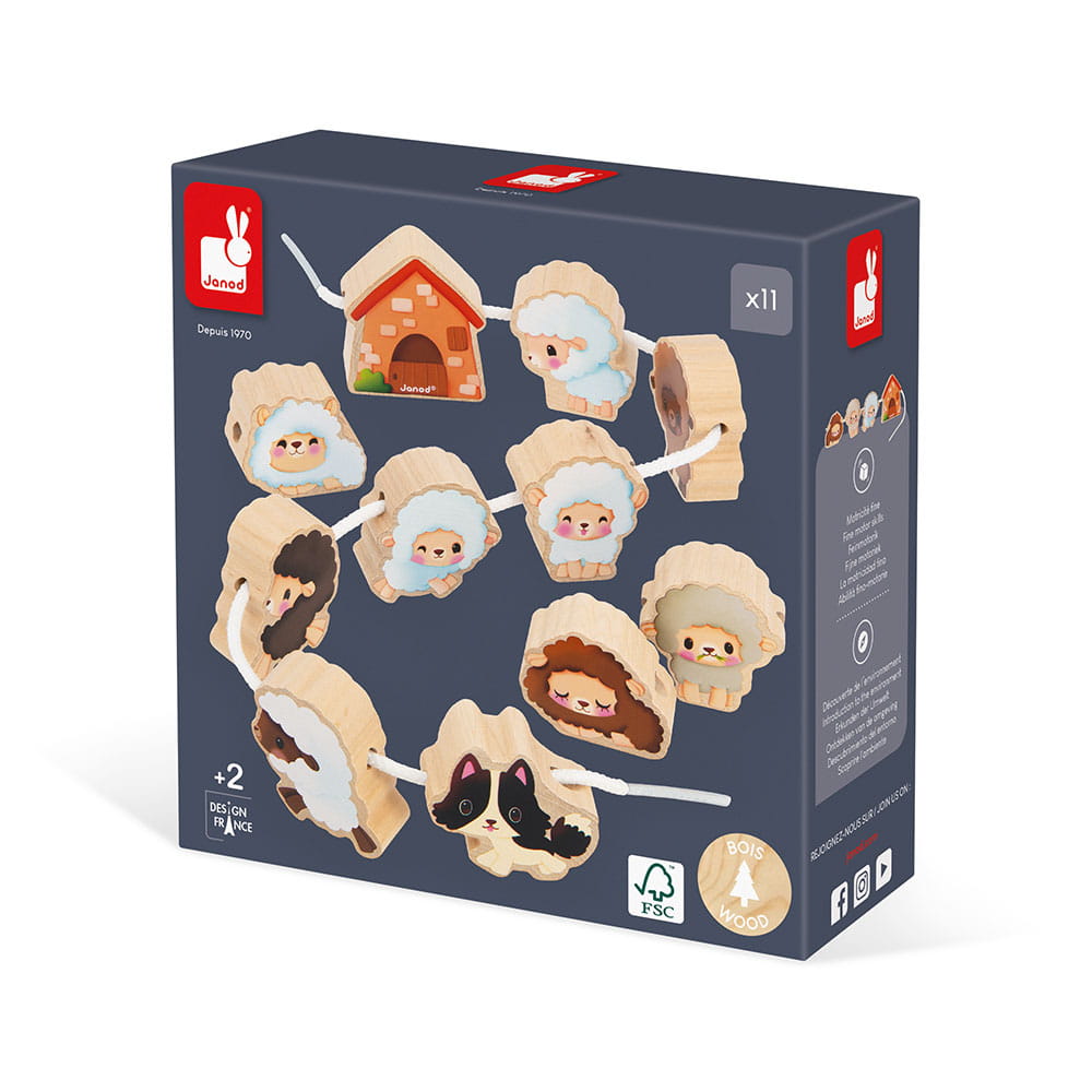 Komplektā ir divas baltas auklas ar laminētiem galiem, uz kurām var uzvilkt koka figūras: 9 aitas, 1 lauku saimniecības ēka un 1 aitu suns, radot dažādas lauku dzīves ainas.