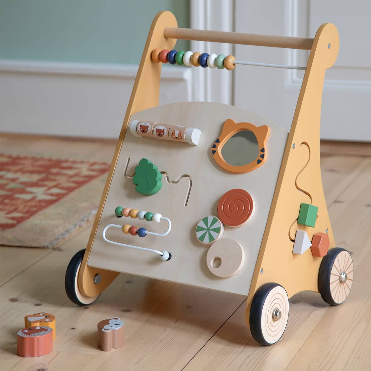 Gājiena palīgs ir aprīkots ar daudziem elementiem, kas stimulē jūsu bērna attīstības posmā esošās maņas.