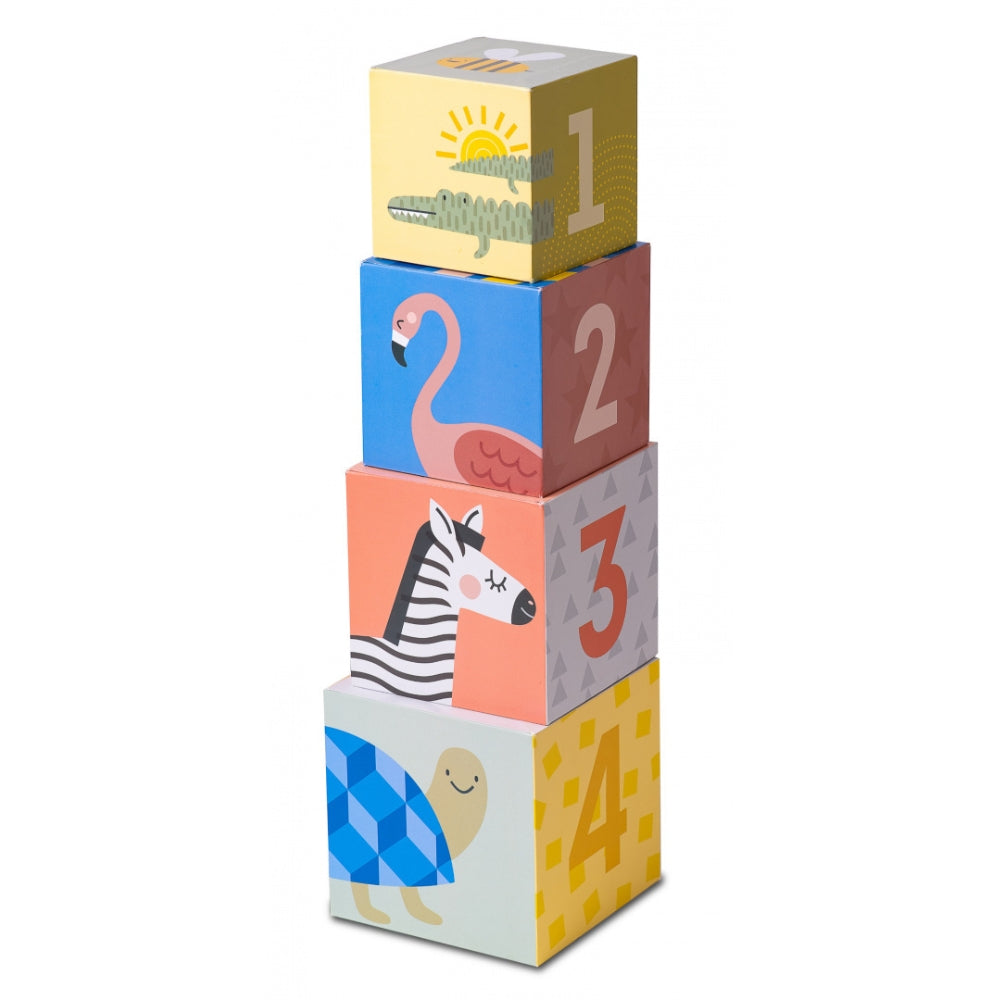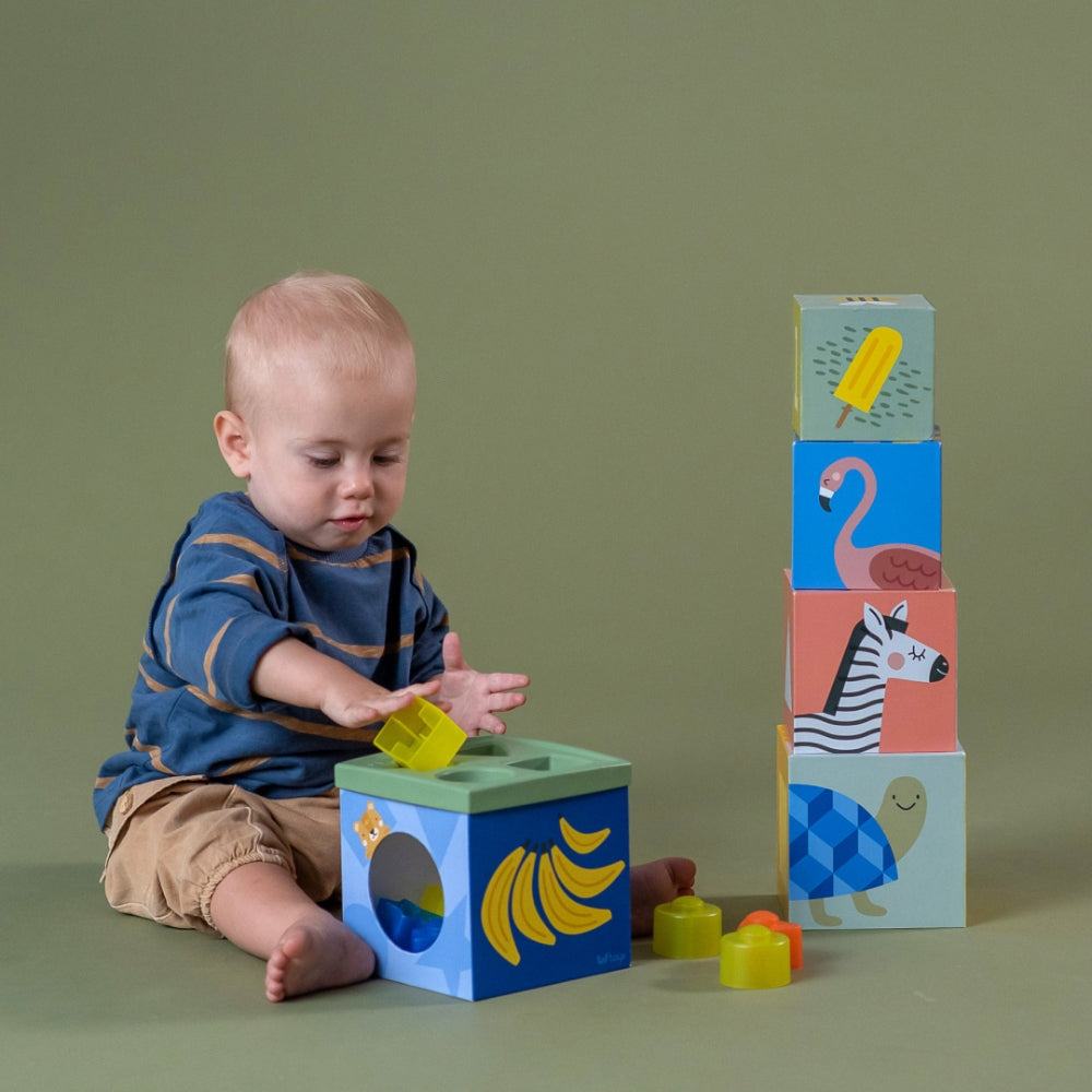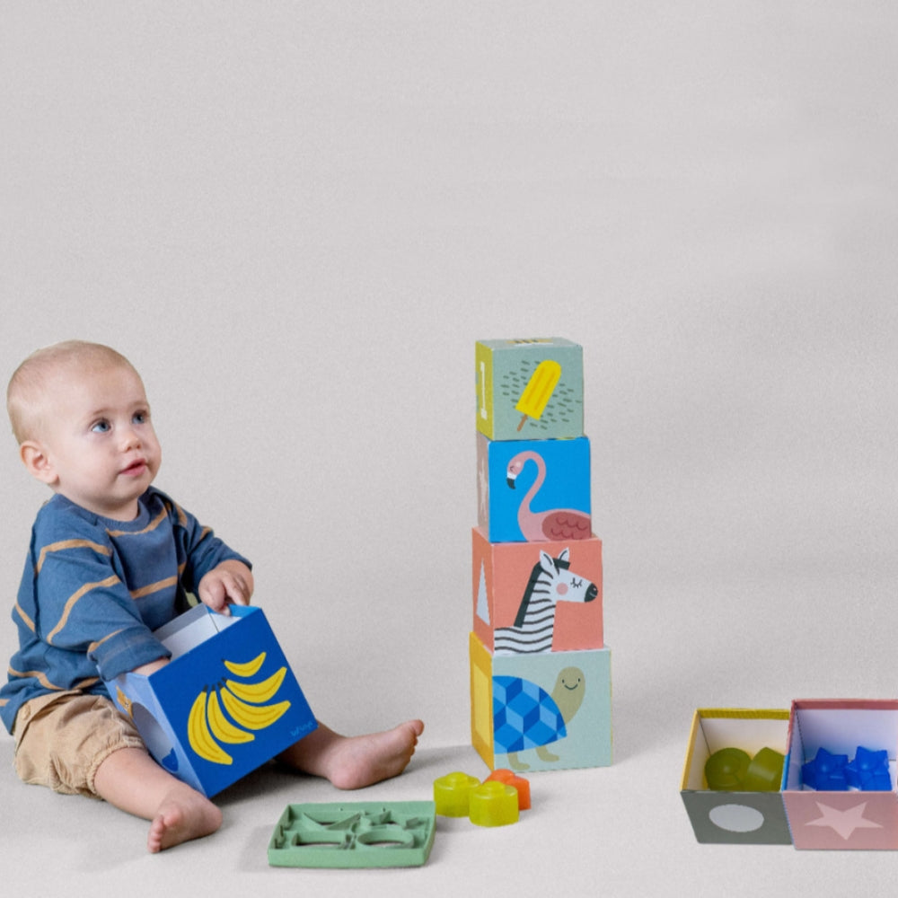 Piecu kastīšu salikšana un torņa stumšana maziem bērniem sniedz atklājumu prieku.
