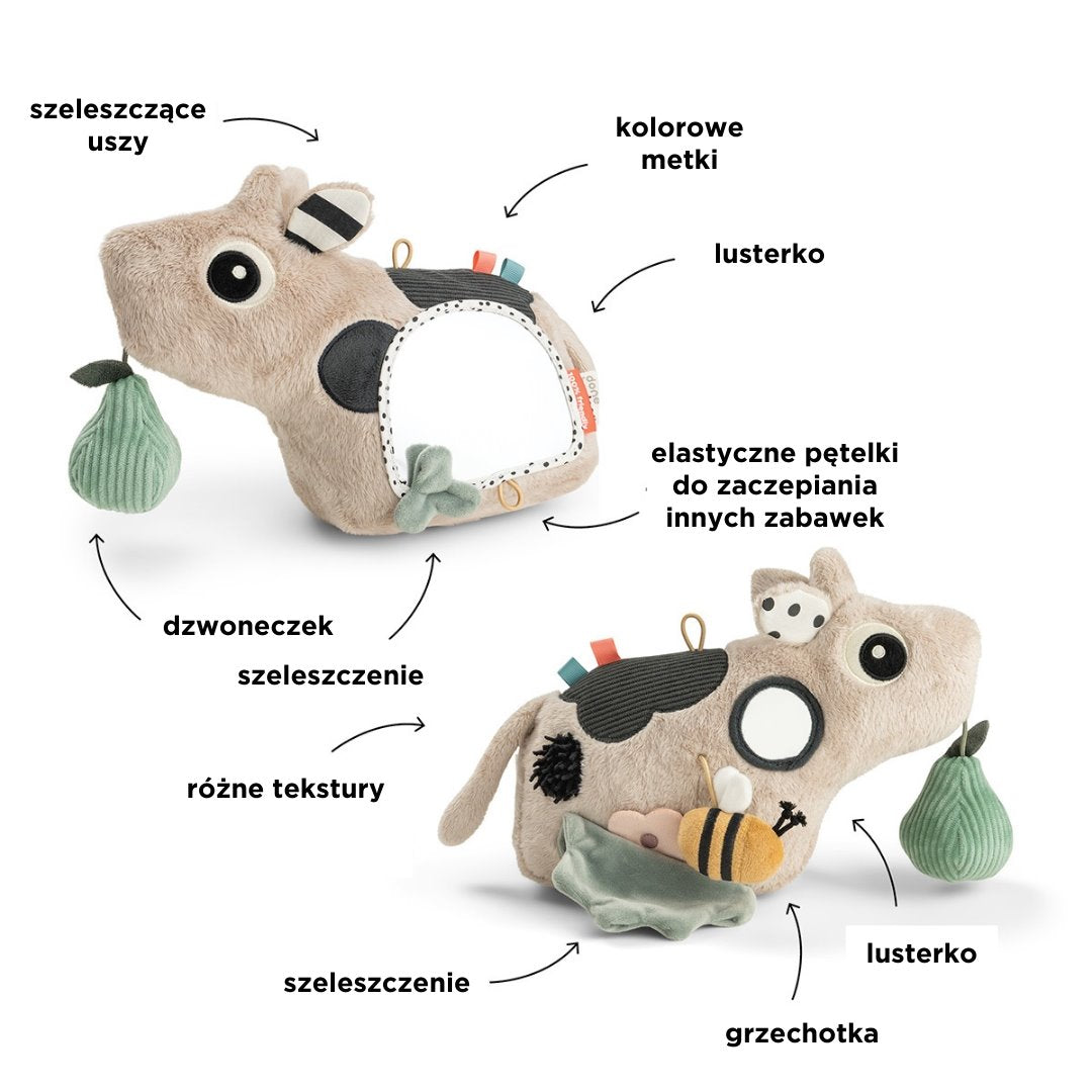 Šis modelis no Done By Deer ir aprīkots ar krāsainiem piekariņiem, dažādām faktūrām, kā arī plaukstošiem un grabošiem elementiem, kas stimulē sajūtas un aicina pētīt.