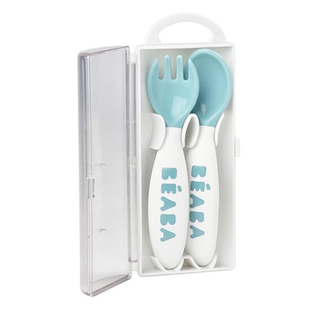 Franču zīmola Beaba zils bērnu galda piederumu komplekts ir veidots tā, lai to varētu viegli turēt pat maziem bērniem.