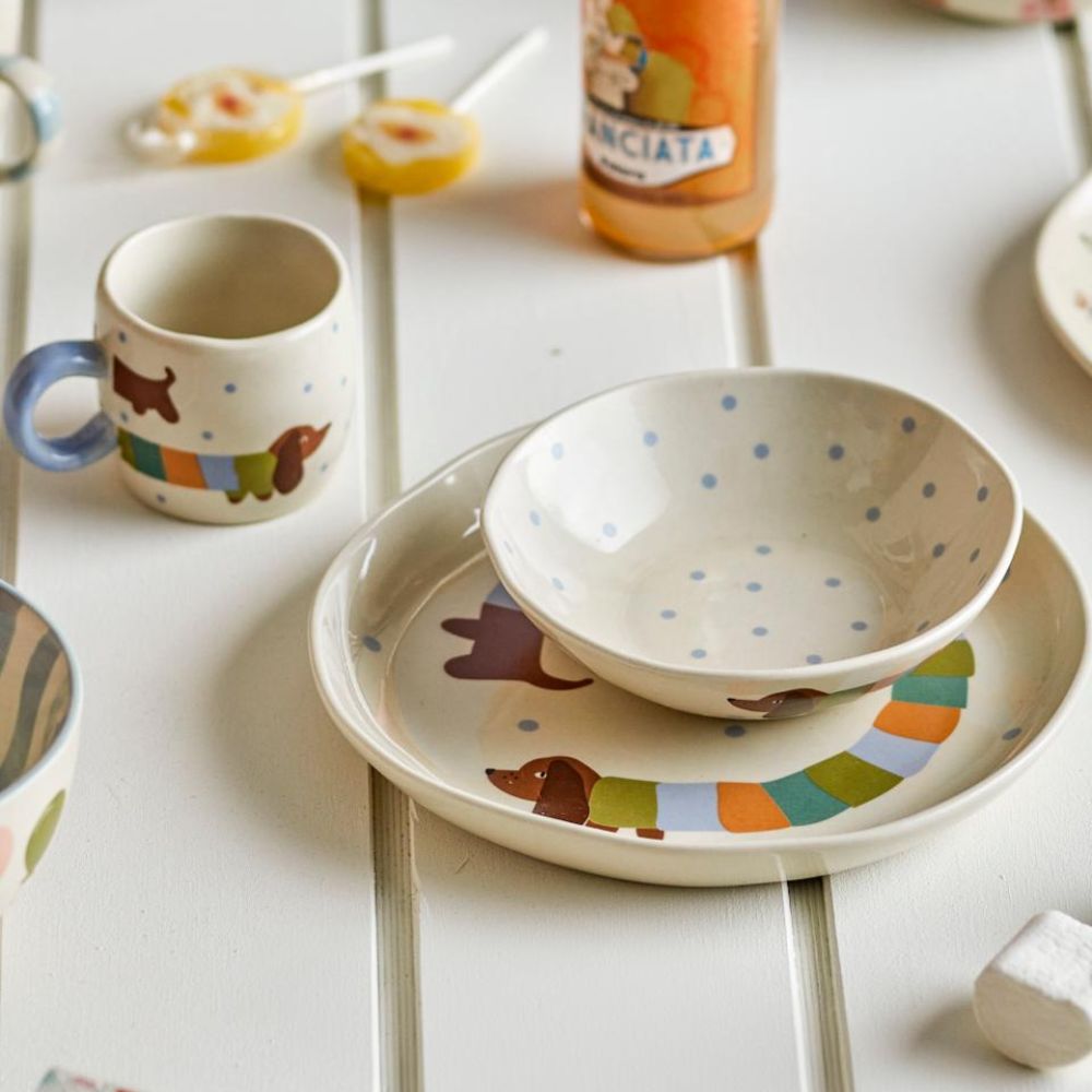 Bloomingville komplektā ietilpst krūze, bļoda un šķīvis, kas visi ir dekorēti ar jauku suņu motīvu un delikātiem punktiņiem maigās toņos, kas iepriecinās gan bērnus, gan pieaugušos.