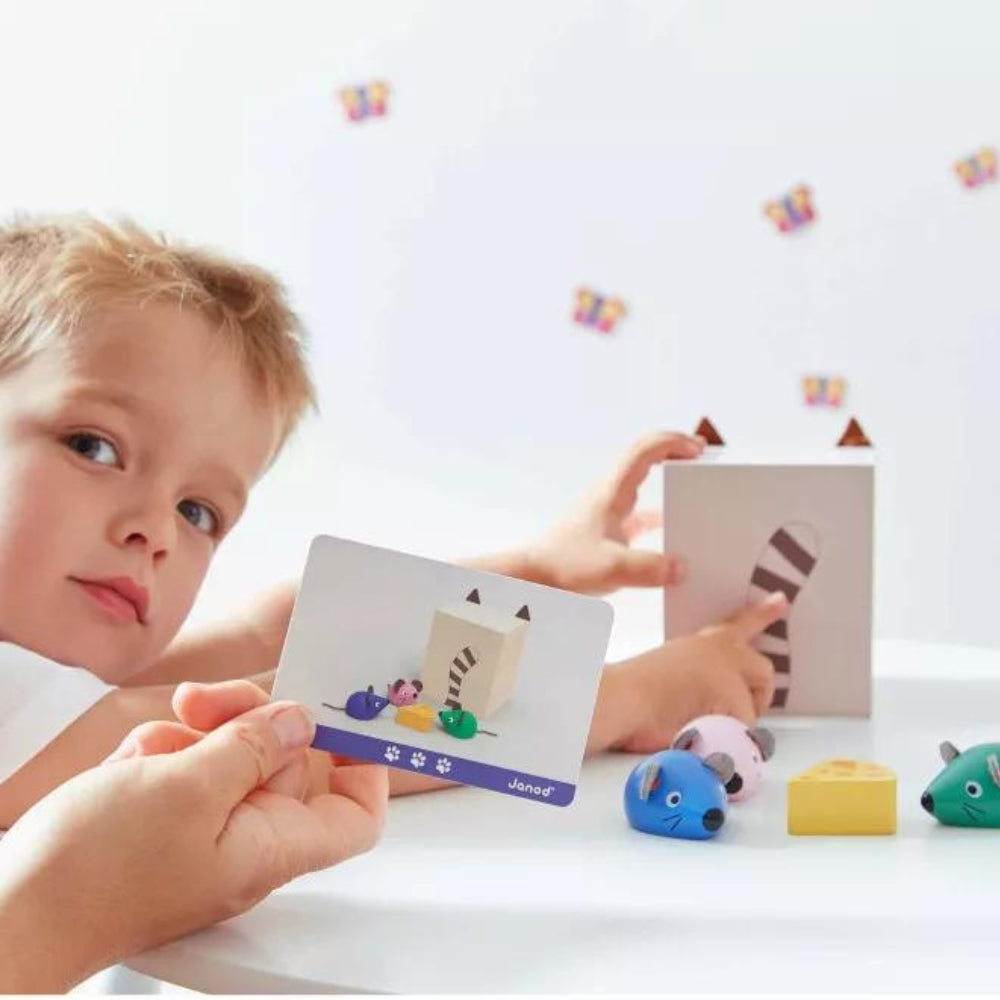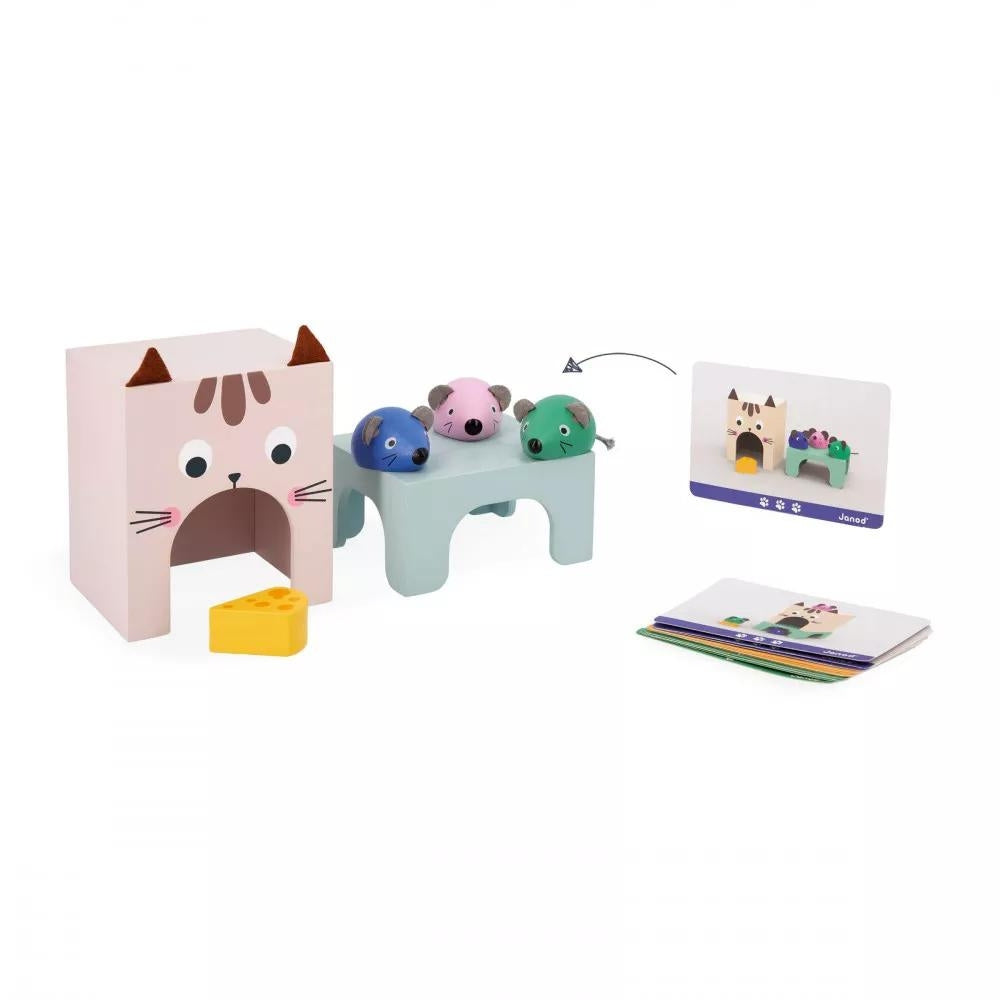 Koka puzle bērniem telpiskās orientācijas attīstīšanai ar kaķi un peli no franču zīmola Janod.