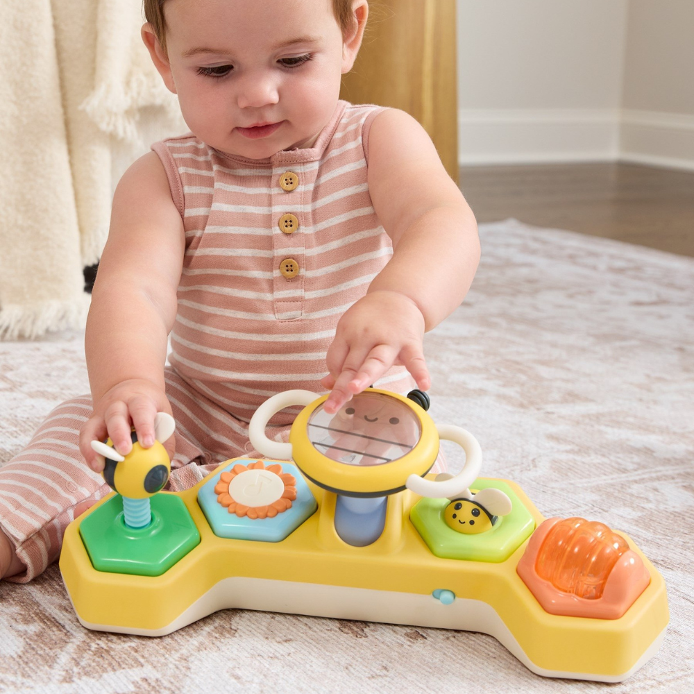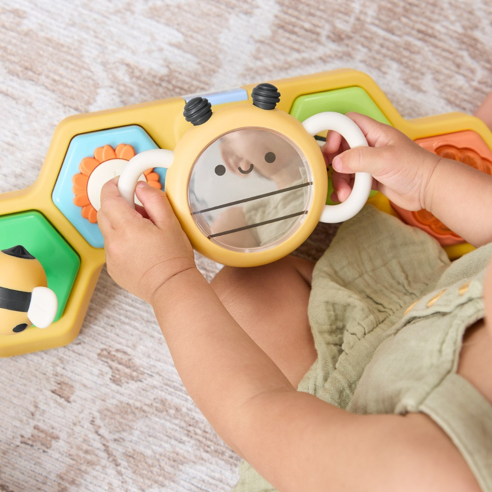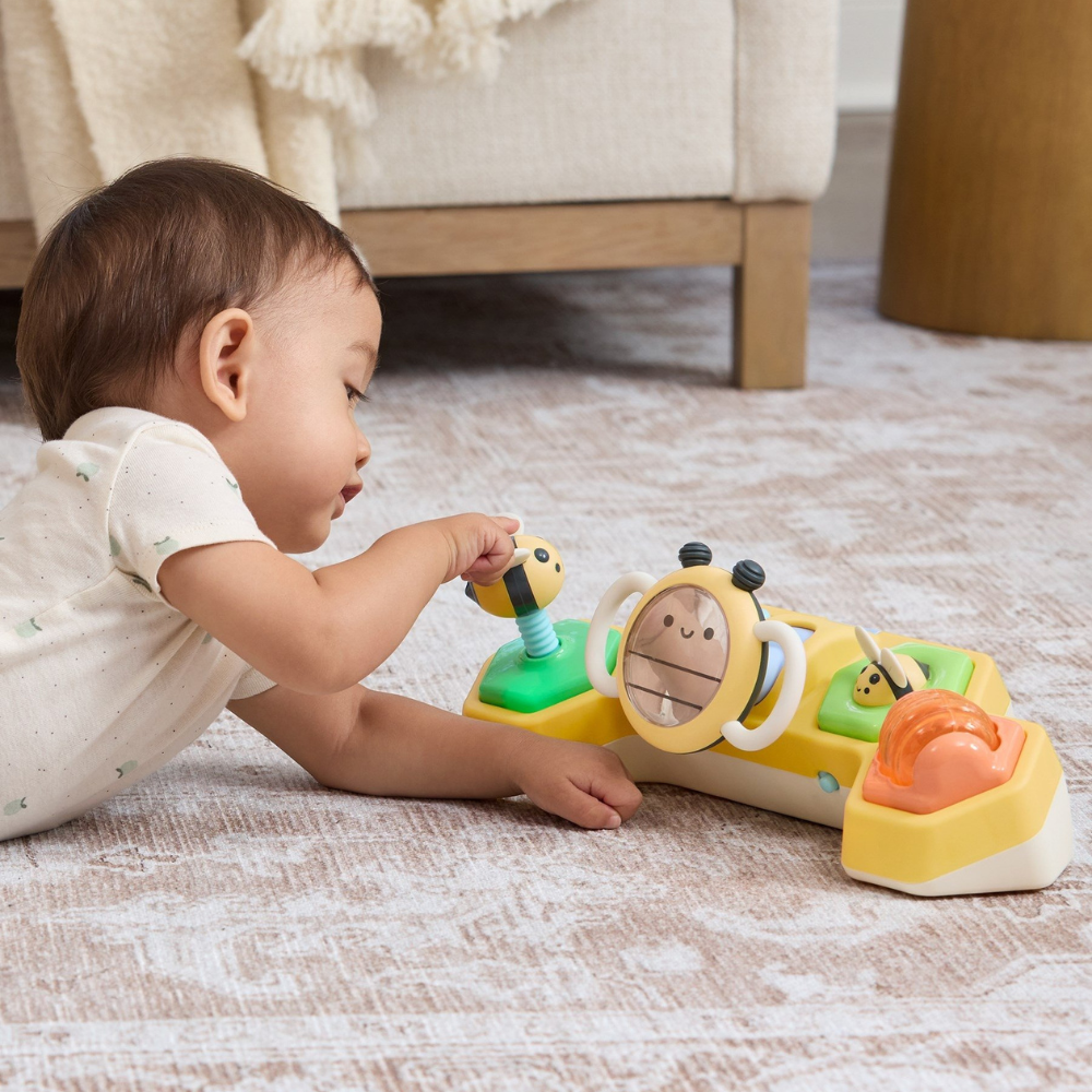 Skip Hop Farmstand 2-in-1 stūres ritenis ar bišu interaktīvo rotaļlietu ir unikāls izstrādājums, kas paredzēts, lai veicinātu bērna attīstību, spēlējoties uz vēdera un sēdus.