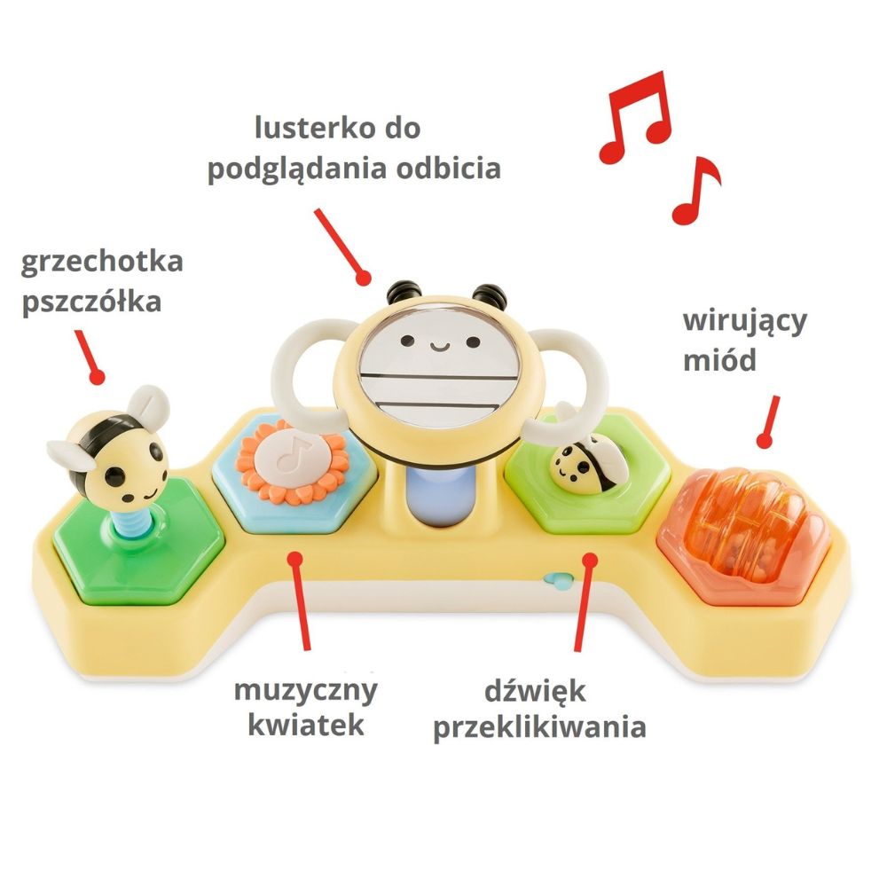 Skip Hop interaktīvajai rotaļlietai ir unikāls divvirzienu regulējams stūres ritenis ar spoguli, ko var iestatīt divās pozīcijās - noliektu uz leju, lai rotaļātos uz vēdera, vai uz augšu, lai rotaļātos sēdus. Rotaļļu, skaņu un dziesmu komplekts nodrošina, ka katrs brīdis ir pilns atklājumu.