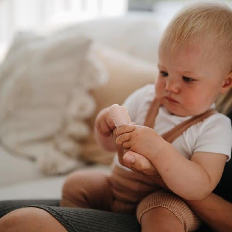 Mushie 2 pirmās Blush &, Shifting Sand pirkstu birstītes maziem bērniem no pirmā dzīves mēneša.