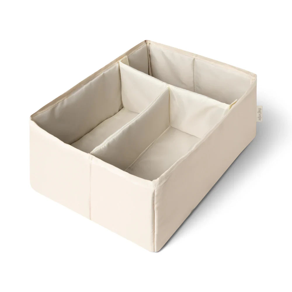 That's Mine autiņbiksīšu organizētājam ir viens liels nodalījums, ko var sadalīt trīs mazākos nodalījumos, izmantojot noņemamus Velcro sadalītājus.