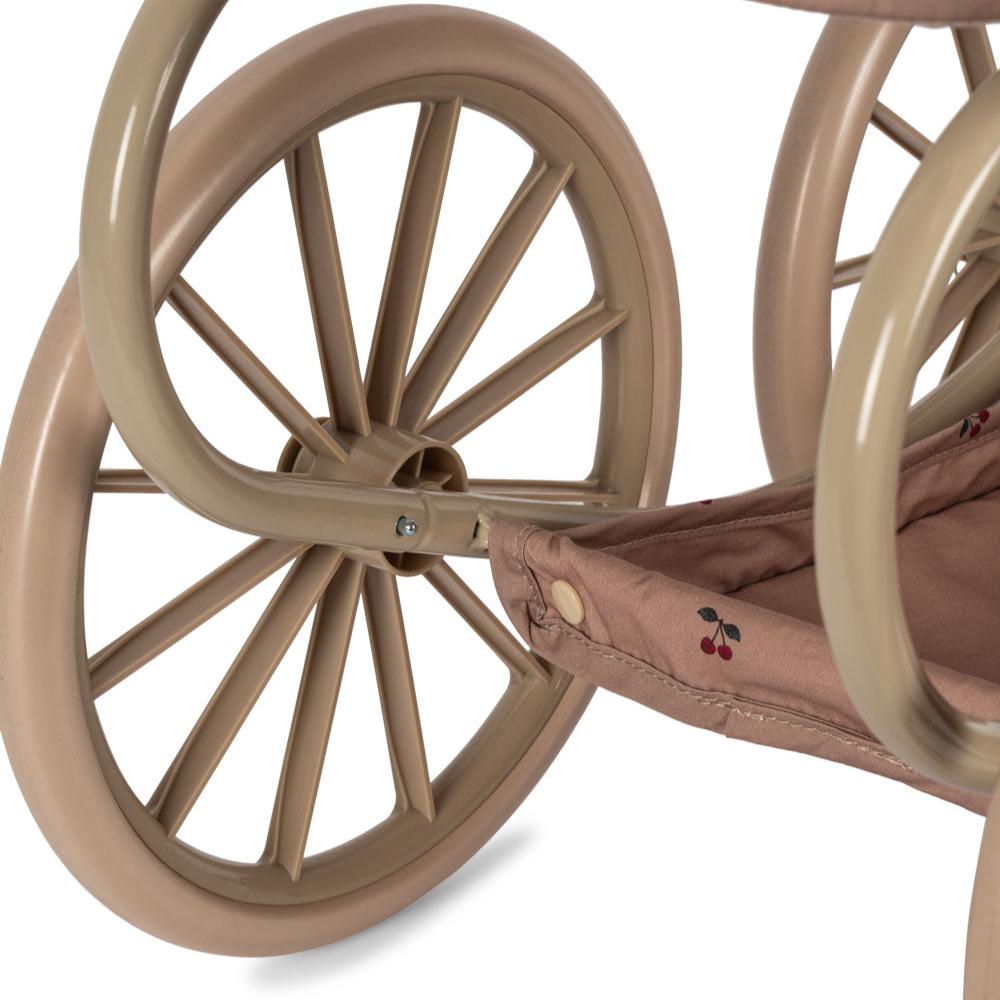 Konges Sløjd vintage stila rožainā lellīšu ratiņi ar četriem lieliem riteņiem un grozu.