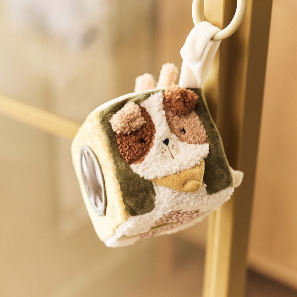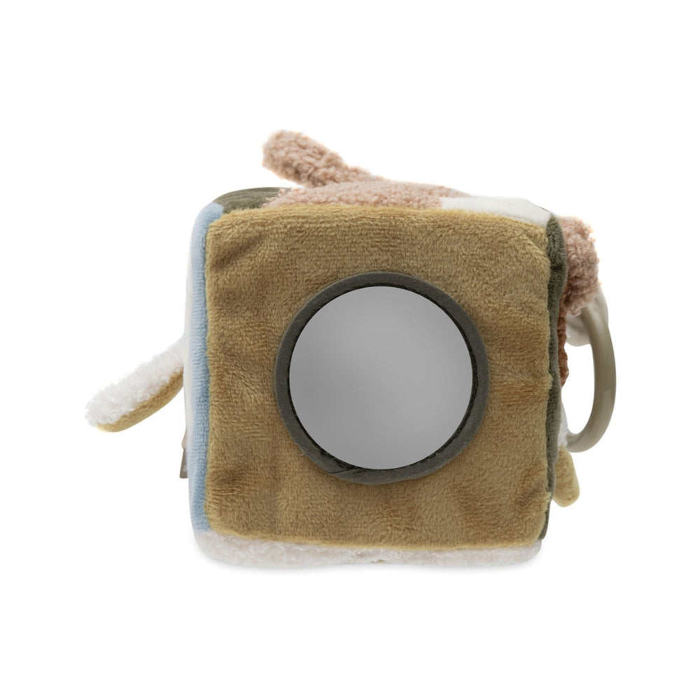 Mācību kubs atbalsta bērna maņu attīstību, pateicoties dažādiem interaktīviem elementiem, piemēram, šūpojošām ausīm un drošības spogulim.