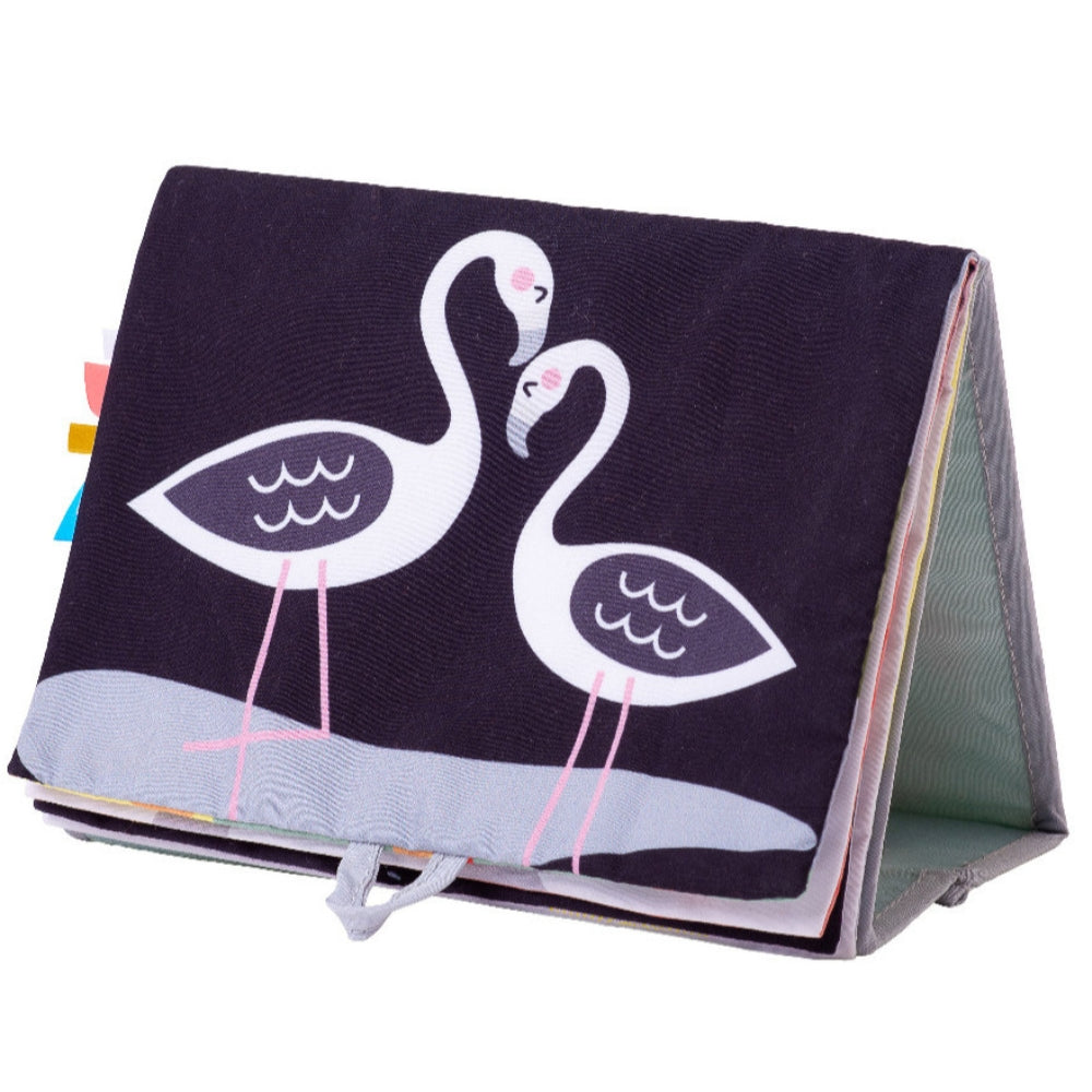 Mīksta Taf Toys interaktīva grāmatiņa mazulim, ar divām lapām diviem attīstības posmiem, lietošanai bērnu gultiņā, ratiņos un vēderiņa laika rotaļām.