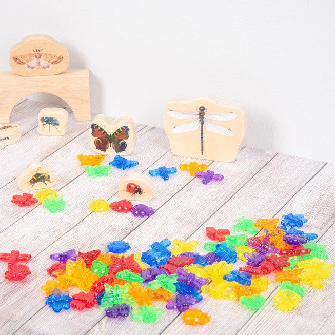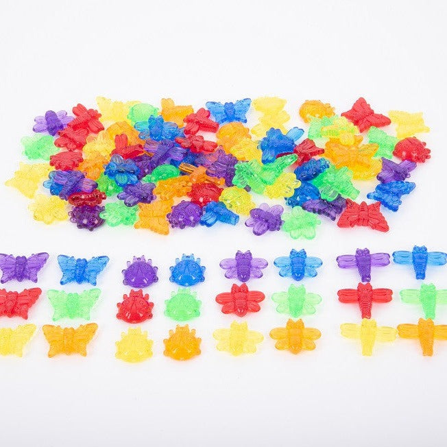Krāsainas, detalizētas kukaiņu figūras skaitīšanai, šķirošanai, modeļu veidošanai un izmantošanai vienkāršās matemātikas aktivitātēs.
