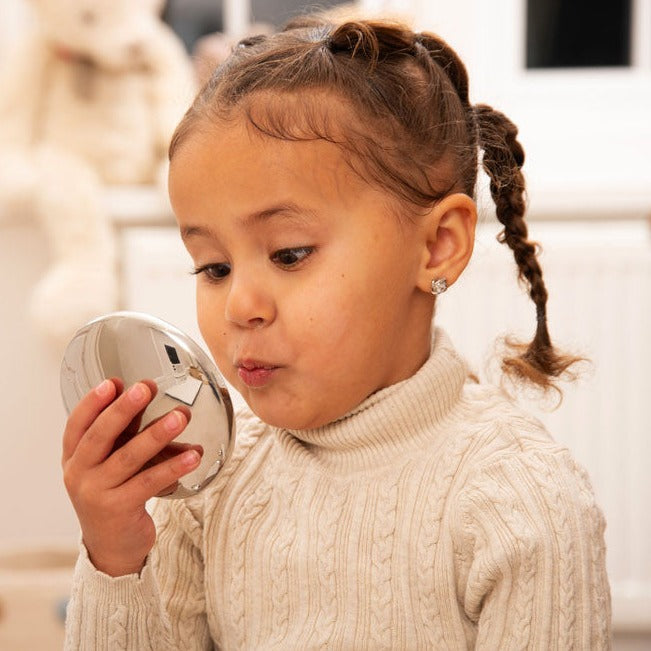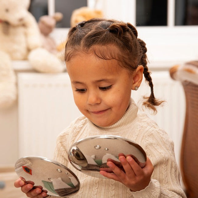 Ar rokām apstrādātā spoguļvirsma nodrošina nedaudz izliektu un izkropļotu atspoguļojumu, kas bērniem šķiet aizraujošs.