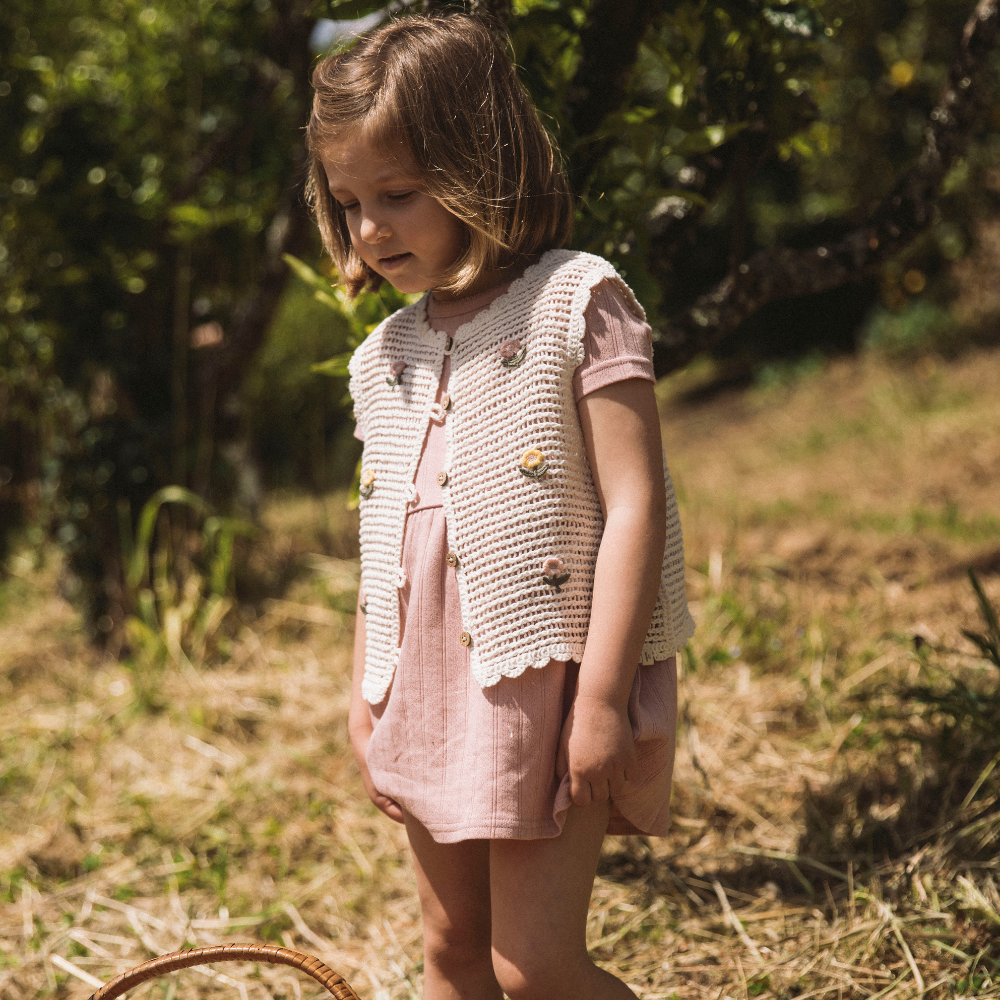 Lil' Atelier bērnu veste ir izgatavota galvenokārt no organiskās kokvilnas, tāpēc tā ir patīkama jutīgai ādai, elpojoša un ērta visas dienas garumā.