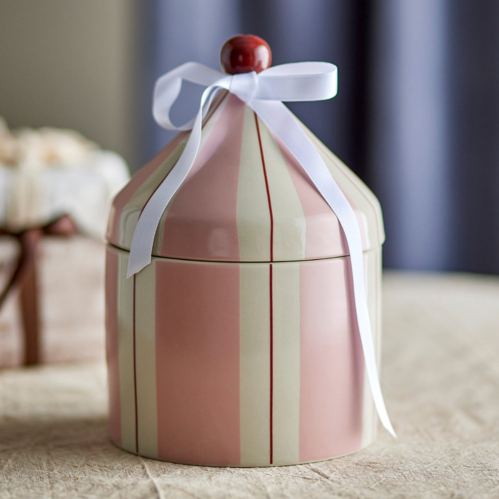 Uzglabāšanas konteiners ir izgatavots no akmensmasas ar ziliem un baltiem svītrainiem un ir izveidots cirkus telts formā.