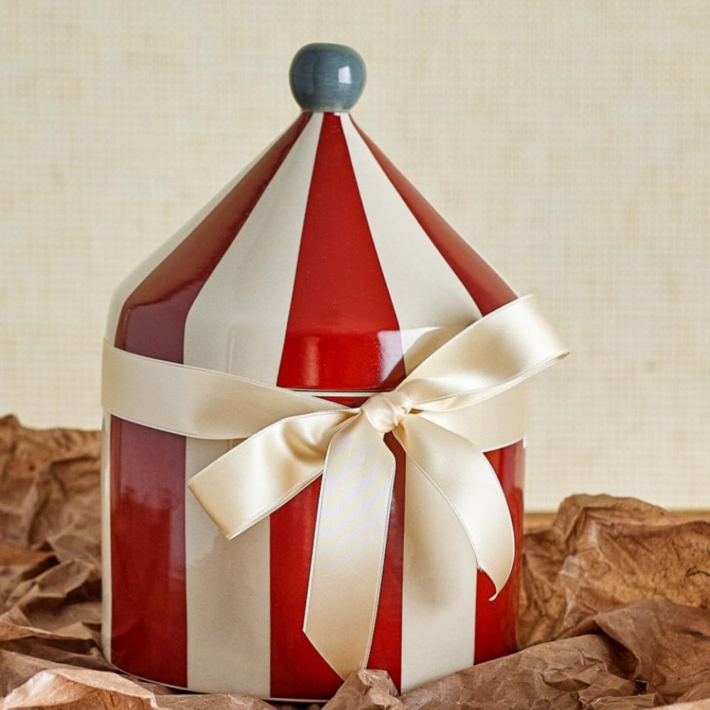 Uzglabāšanas konteiners ir izgatavots no keramikas ar sarkanām un baltām svītrām un tam ir jauka cirka telts forma.