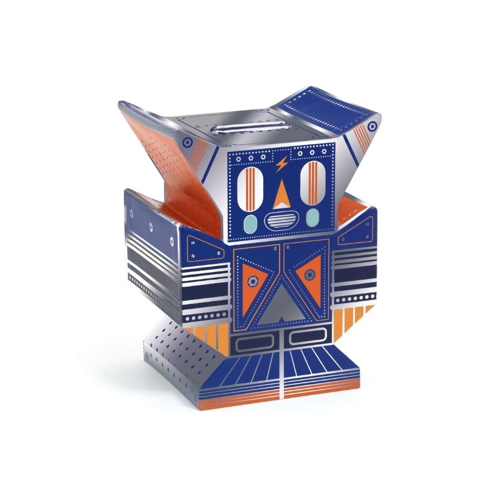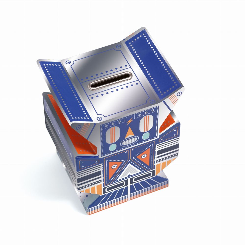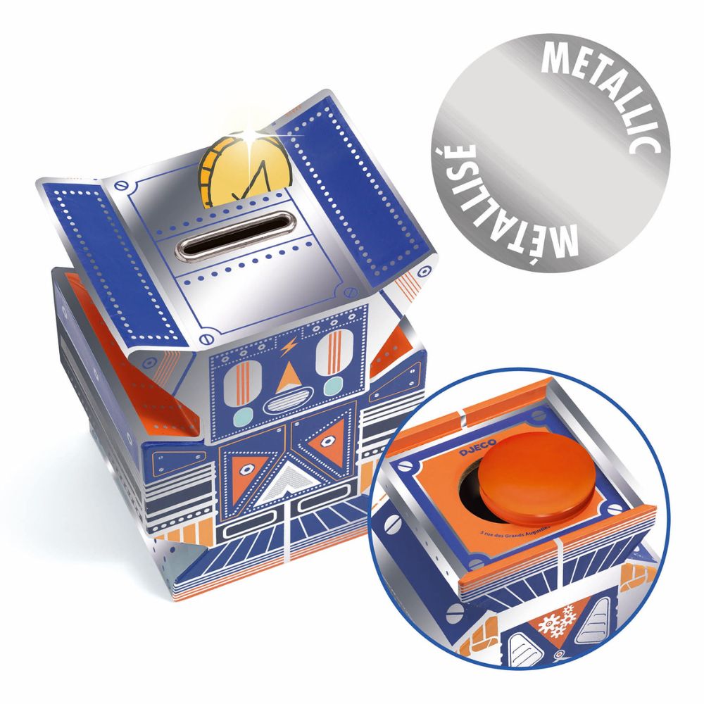 Šī Djeco bērnu krājkase koka robota formā ir dekorēta ar metālisku spīdumu.