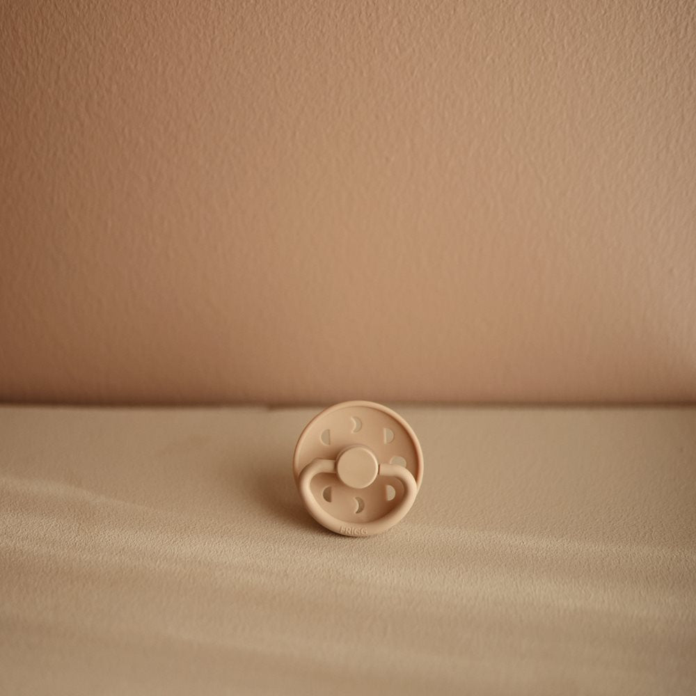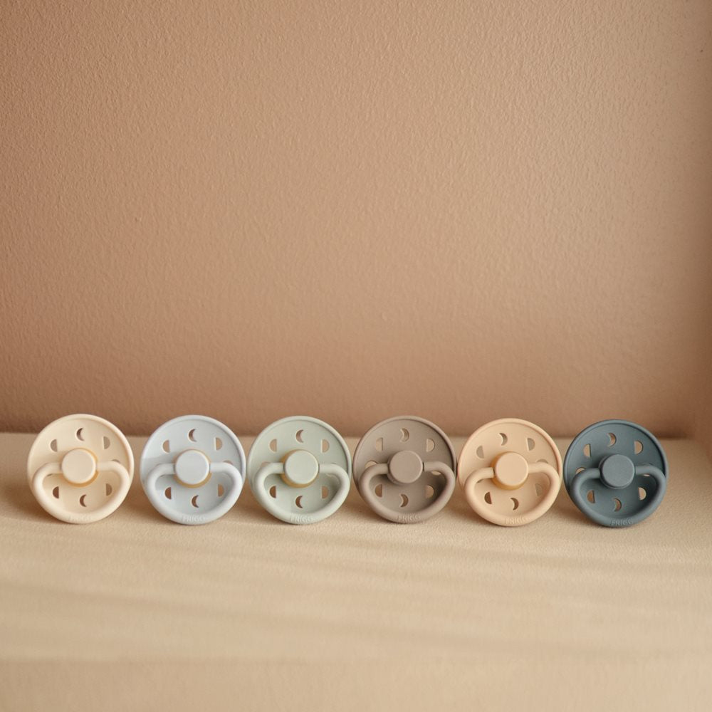 Frigg ražotais Moon Rubber Croissant Baby Pacifier Size 1 ir ideāls gan zēniem, gan meitenēm.