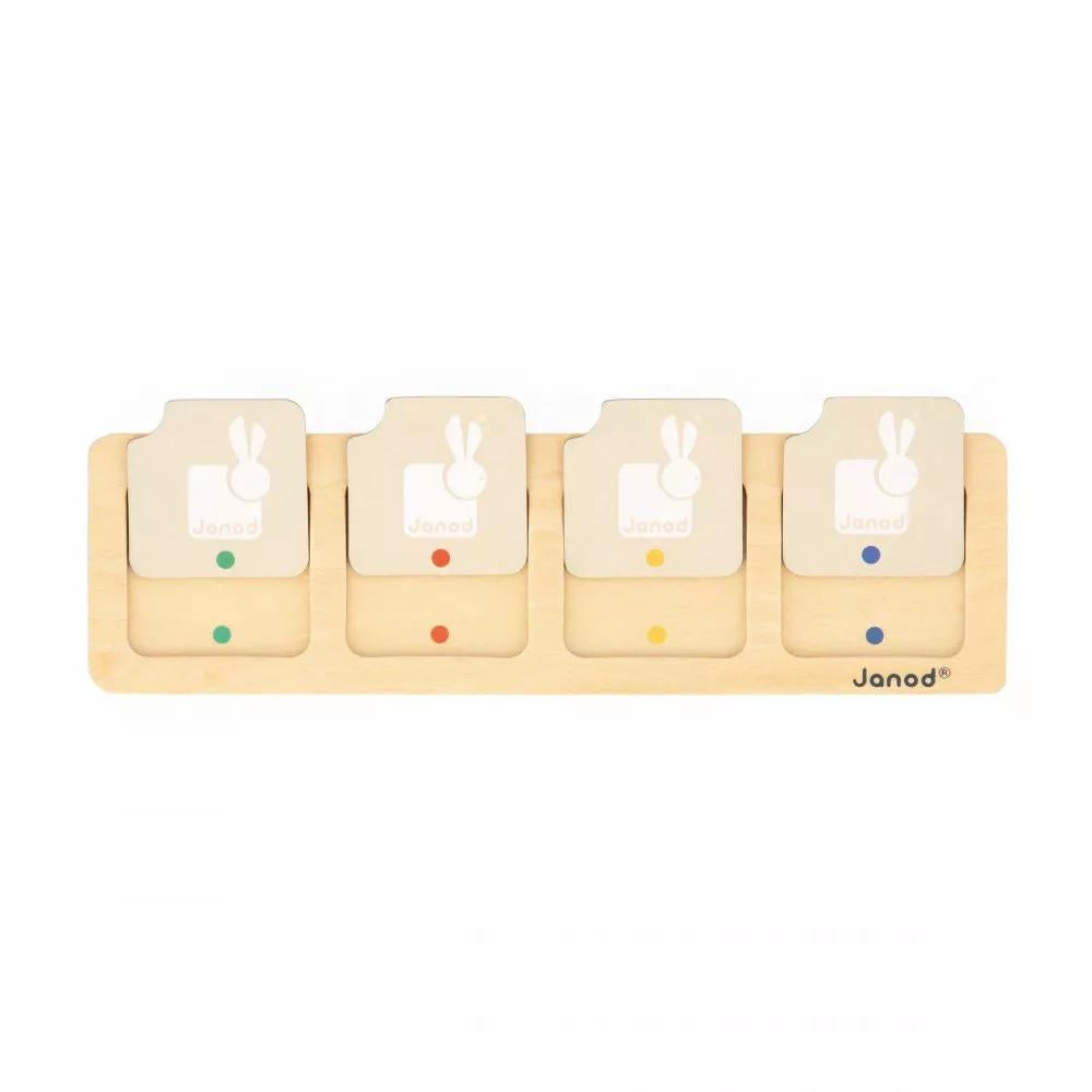 Janod komplekts sastāv no koka statīva un desmit secības karšu komplektiem, kuros ir 4 gabali.