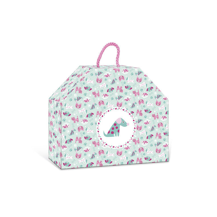 Viss komplekts ir iepakots skaistā kartona kastē, kas izskatās kā māja ar rokturi.