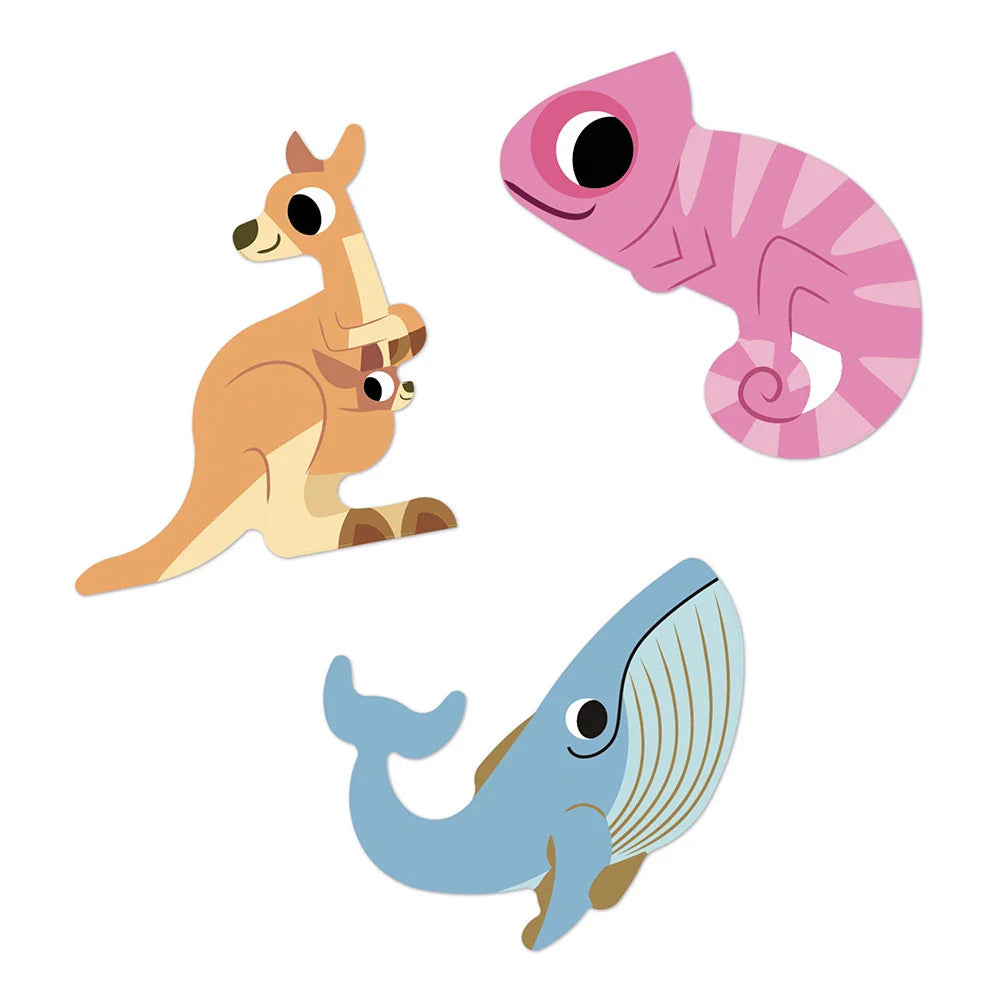 Iepakojumā atradīsižirafi, zebras, tīģeri, tukani, pērtiķi, kengurus un daudzus citus eksotiskus draugus no visas pasaules.