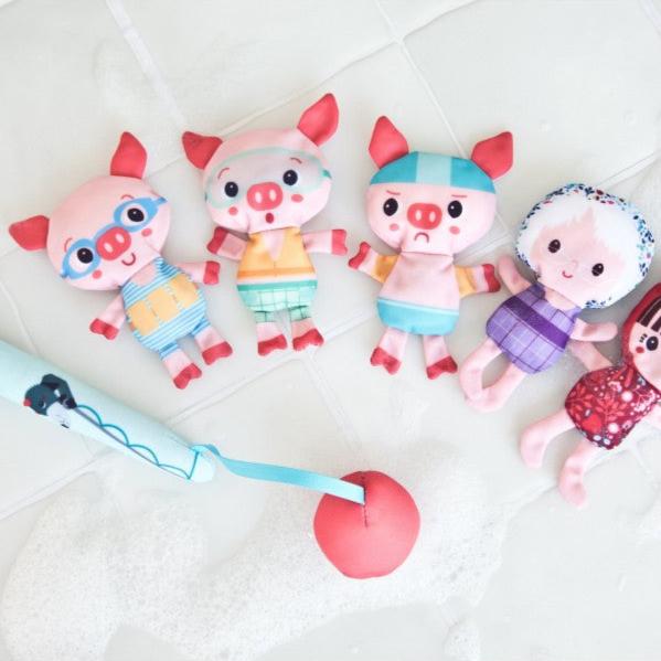 Šie tēli ir trīs cūciņas peldkostīmos un cepurēs, Sarkangalvīte un vecmāmiņa peldkostīmos.