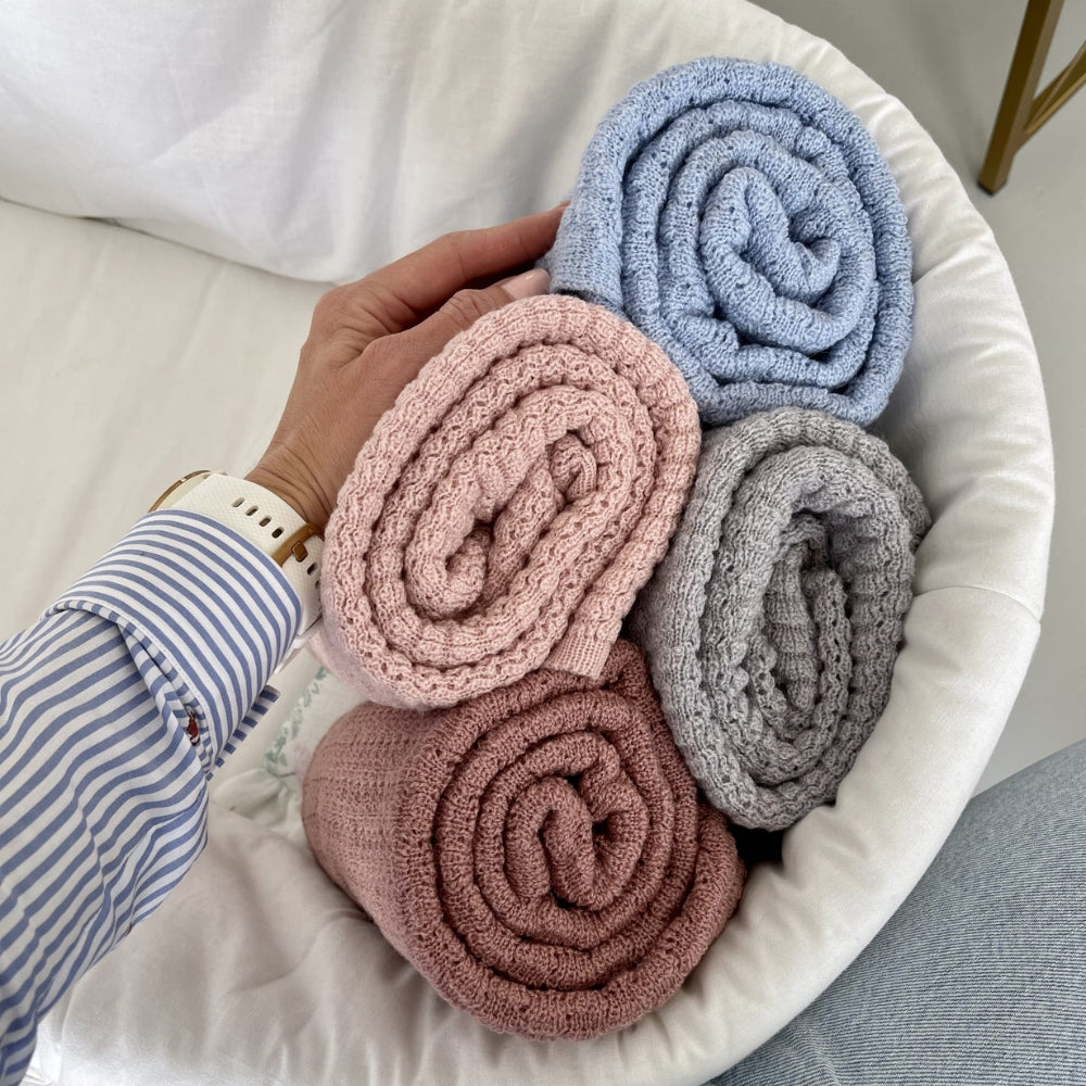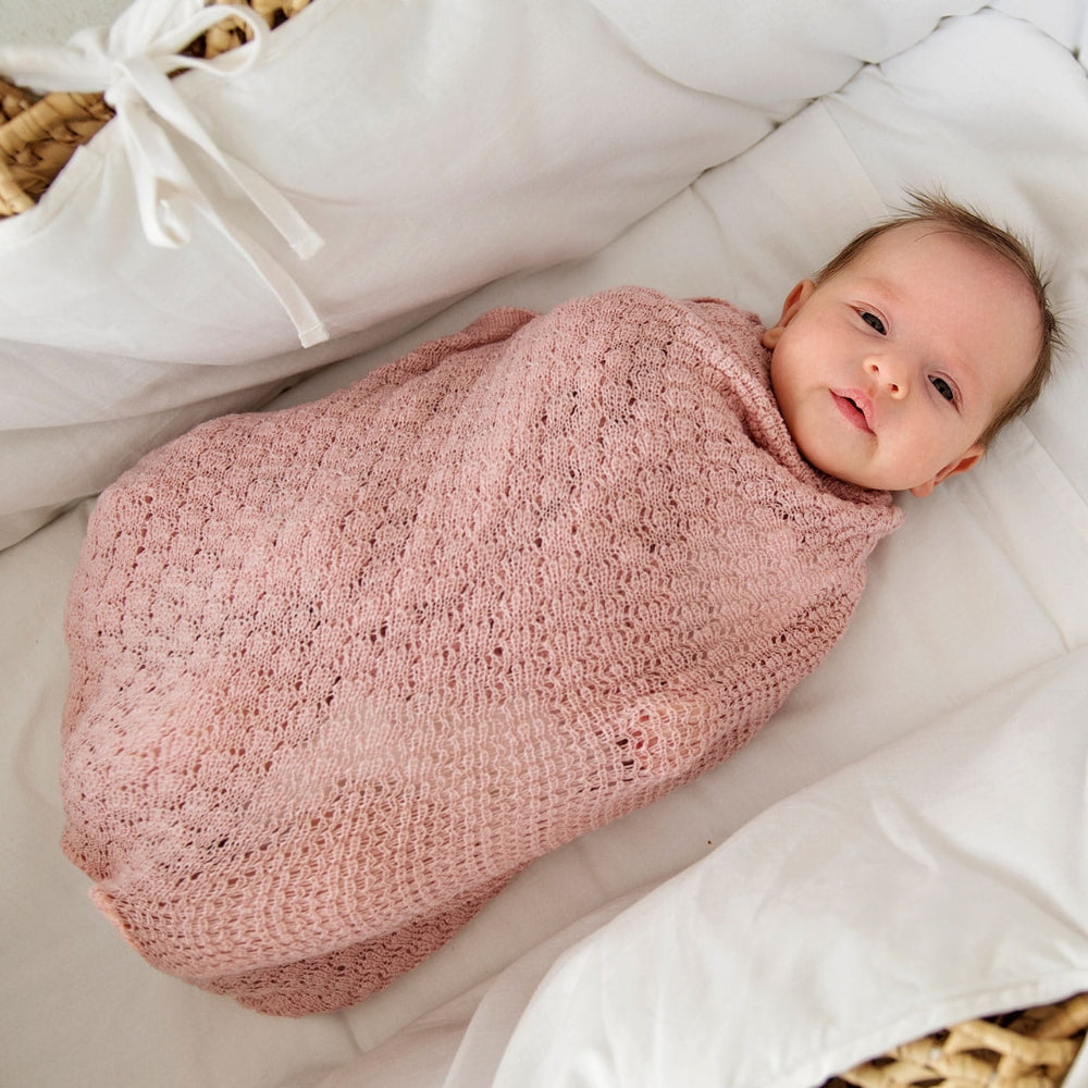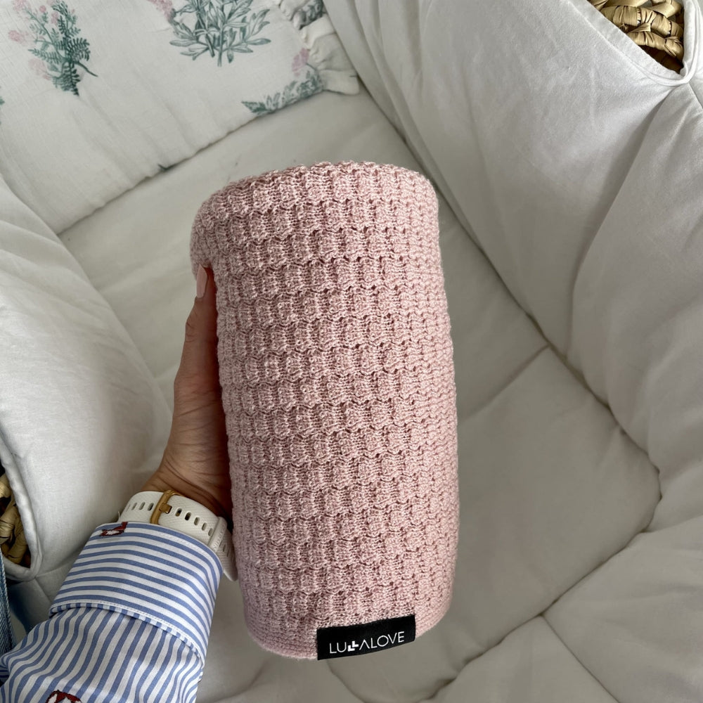Mīkstā merino vilnas sega ar tauriņu rakstu rozā krāsā var tikt izmantota arī kā bērnu sega no LullaLove.