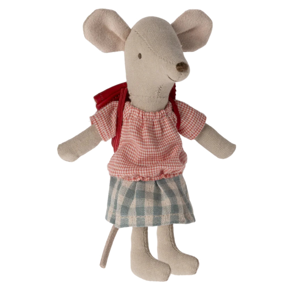 Maileg pele ir tērpta zilā rūtainā kleitā, sarkanā krekliņā ar baltiem rūtiņiem un sarkanā mugursomā.
