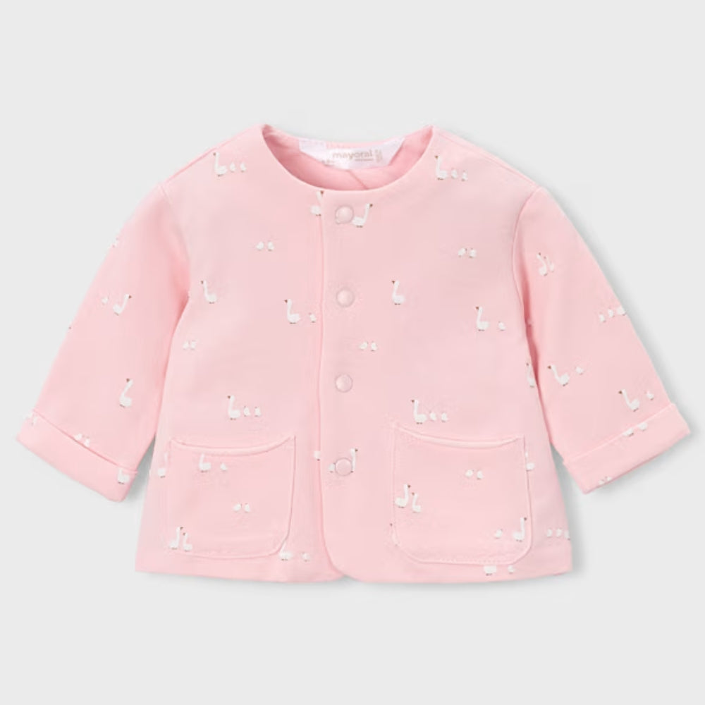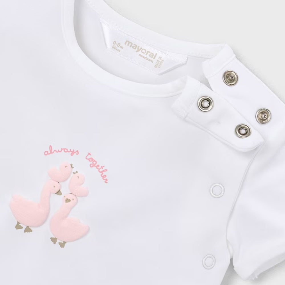 Mīlīgais mazais zoss motīvs padara jaundzimušo komplektu īpaši maigu un bērnišķīgu.