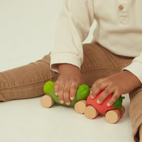 Oli &, Carol ražotais Strawberry Sweetie ir bērnu automašīna un bērnu zobu riņķis vienā, kas ir videi draudzīgs un pilns ar prieku.