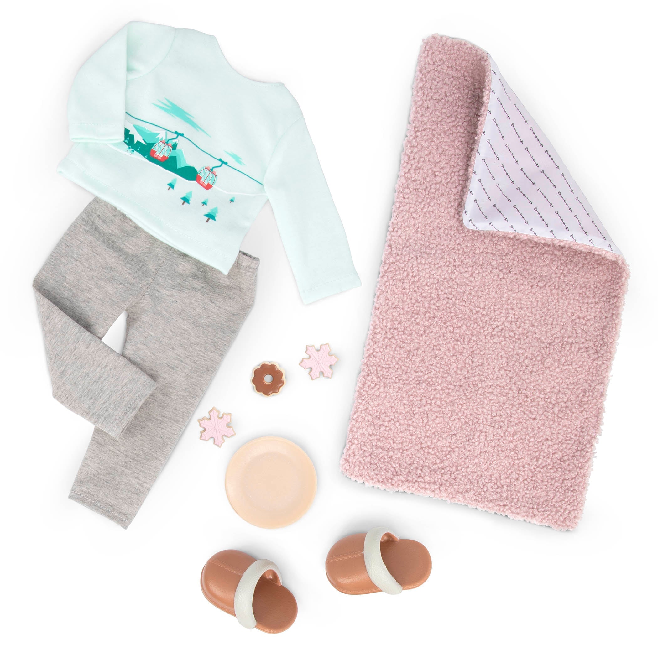 Komplektā ietilpst arī: divdaļīga pidžama, blūze ar garām piedurknēm un garas bikses, čības, silta sega, krūze ar karsto šokolādi, šķīvis, 3 cepumi.