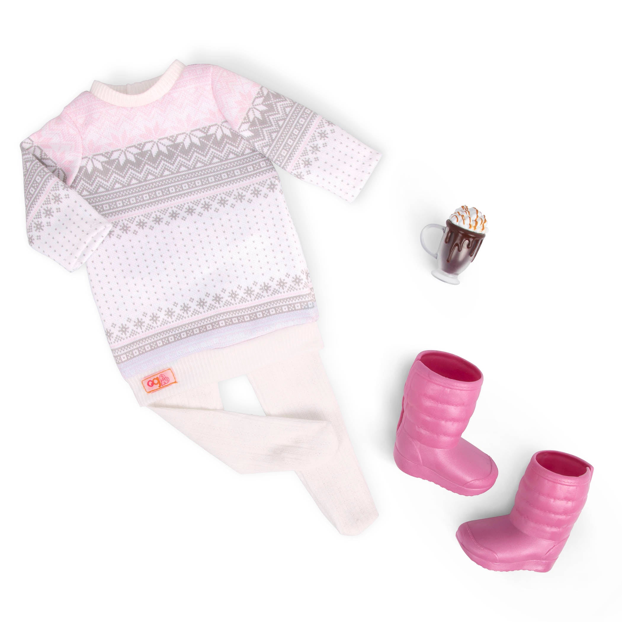 Komplektā ietilpst: 46 cm lelle, adīta kleita ar ribotu apakšmalu, zeķbikses, apakšveļa, sniega zābaki.