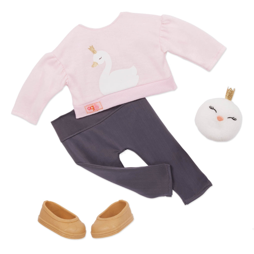 - Komplektā ietilpst: 46 cm lelle, blūze ar gulbju motīvu, augstas jostas legingi, plīša "gulbju" spilvens, apakšveļa un kurpes