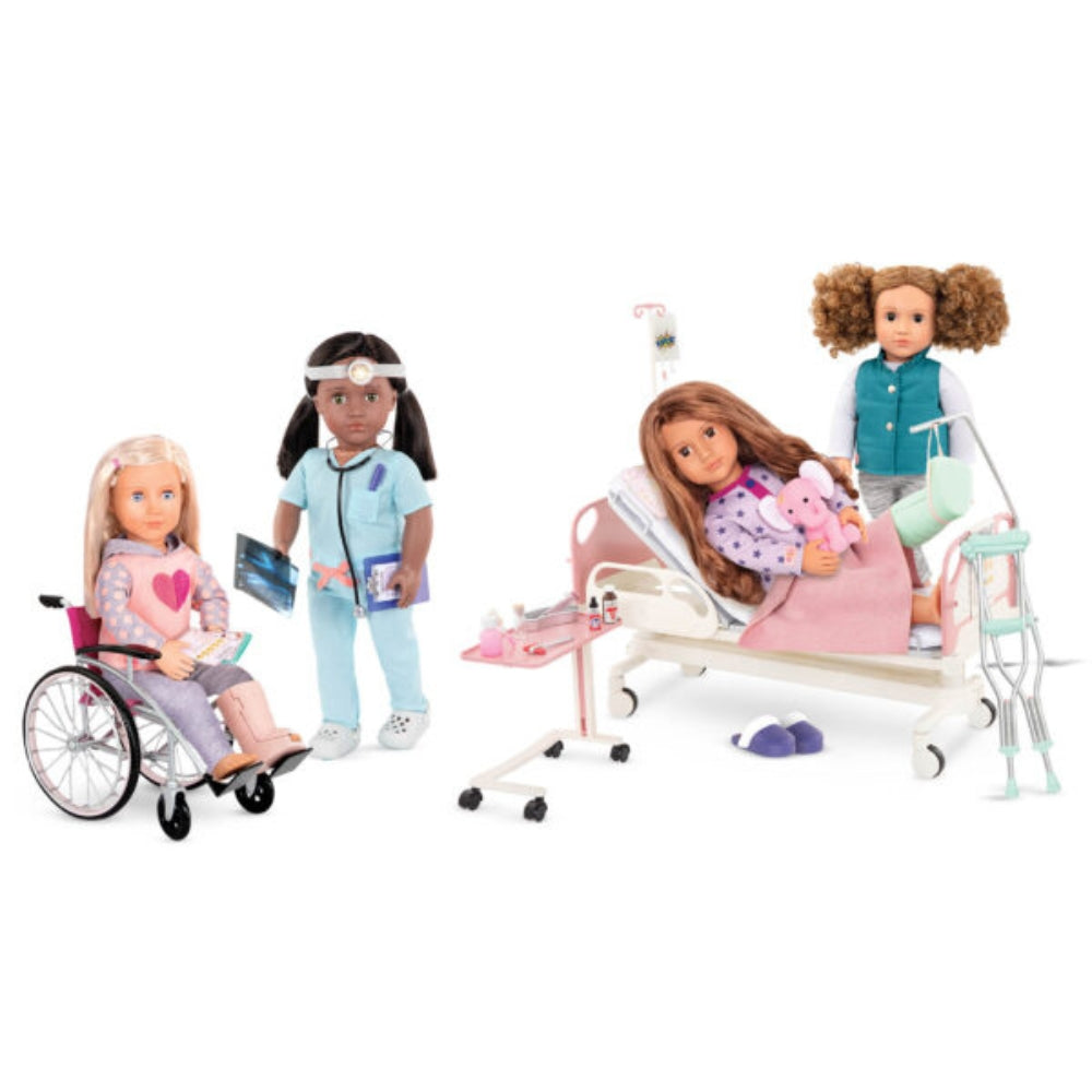 Regulējami OurGeneration lelles piederumi: slimnīcas gulta uz riteņiem ar matraci, spilvenu un sega, kā arī kāju pacēlājs.