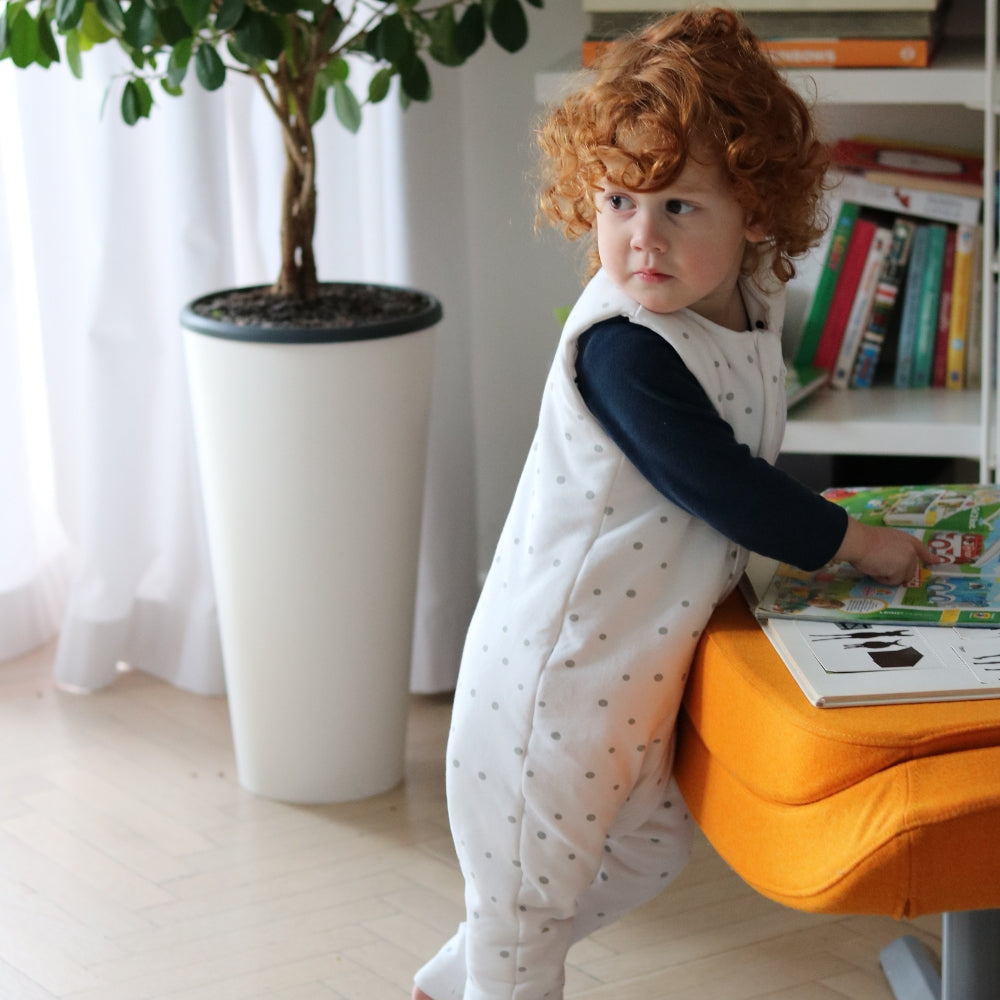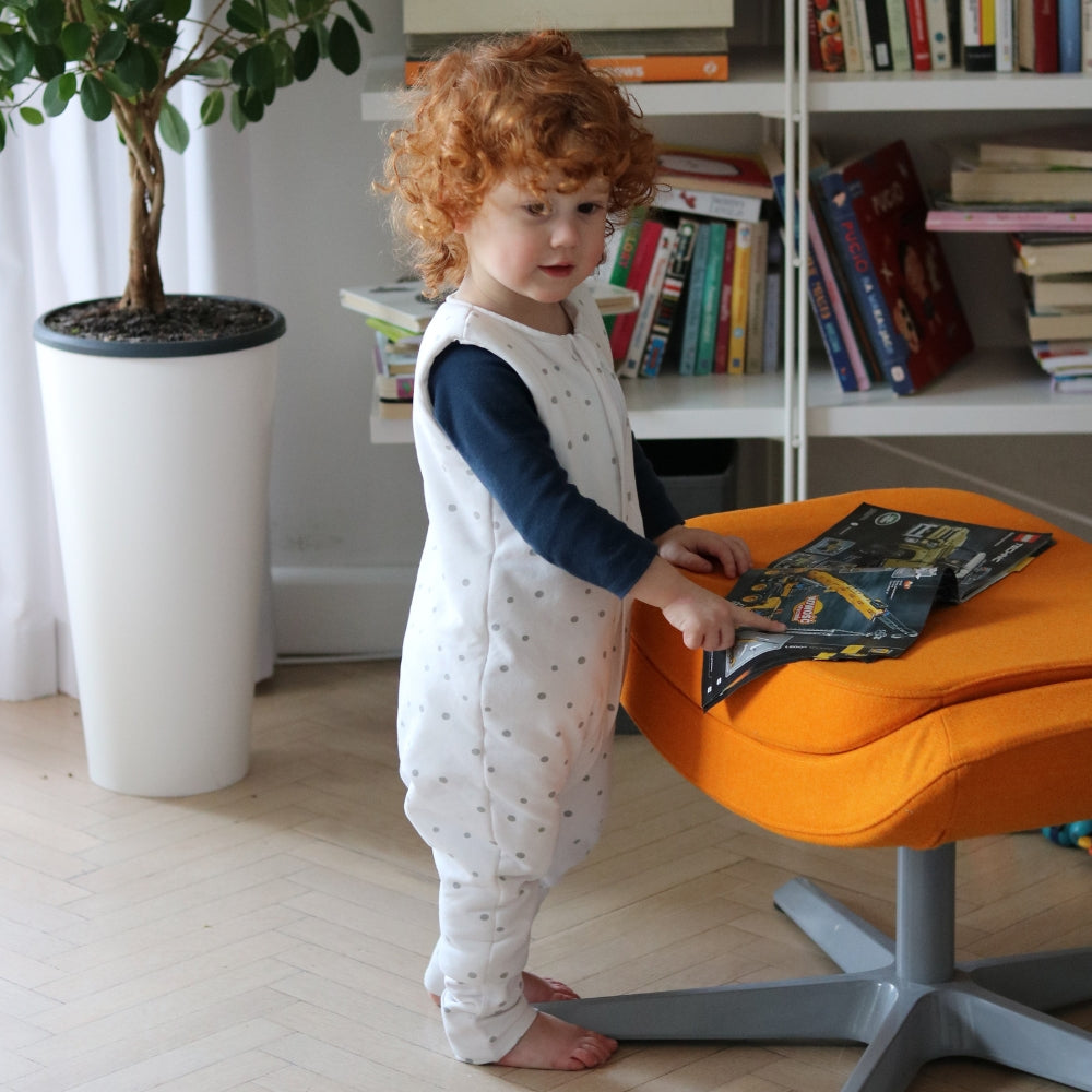 Šis novatoriskais divpusējais guļammaiss ar pelēkiem/melnajiem punktiņiem (3–4 gadi) no Sleepee.