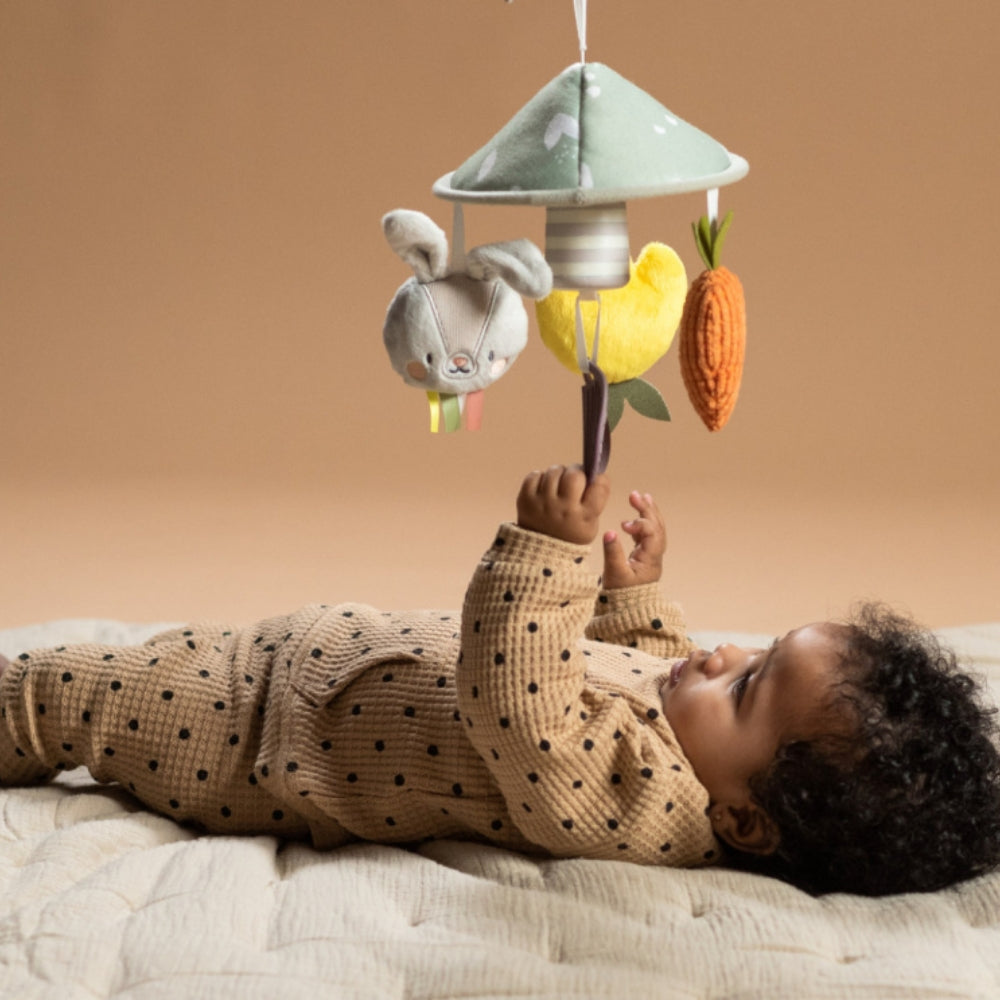 Tajā ir dažādi elementi, piemēram, jaukais zaķis Rylee, karotes un tulpes, kas karājas no zaļā nojumes un veicina mazuļu vizuālās uztveres attīstību.