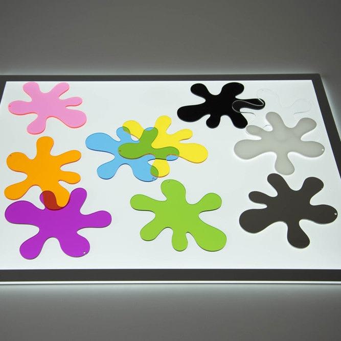 Šis jautrais „krāsu pilienu” figūru komplekts ir radošs rīks, kas izgatavots no 3 mm bieza krāsaina, caurspīdīga, necaurspīdīga un spoguļveida akrila. Katra figūra ir pieejama primārajās un sekundārajās krāsās, piemēram, sarkanā, zilā, dzeltenā, zaļā, oranžā un violētā, kā arī caurspīdīgā, melnā, baltā un divpusējā spoguļveida versijā.