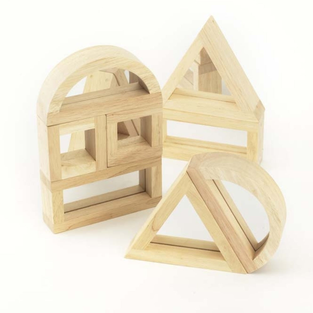 Šajā komplektā ir 8 lielas gumijkoka detaļas ar divpusējiem akrila spoguļu ieliktņiem.