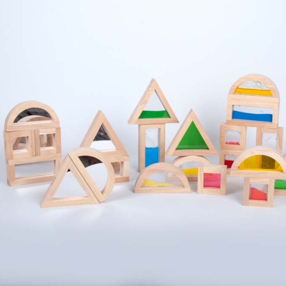 Koka klucīši bērniem var tikt kombinēti ar sensorisko koka klucīšu komplektu, kas ir ideāls papildinājums kolekcijai.